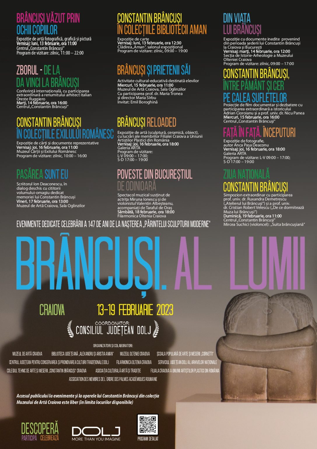 În ziua de 15 februarie, Muzeul de Artă, prin spațiile pe care le pune la dispoziție în Sala Oglinzilor și la Centrul „Constantin Brâncuși”, este gazda evenimentelor „Brâncuși și prietenii săi”, activitate cultural-educativă destinată elevilor, și „Constantin Brâncuși, între Pământ și Cer pe Calea Sufletelor”, o proiecție de film documentar și dezbatere. Expoziția de cărți și documente reprezentative „Constantin Brâncuși în colecțiile Exilului Românesc” va deschide seria inițiativelor desfășurate joi, 16 februarie, care mai cuprinde „Brâncuși reloaded” și „Față în față. Începuturi”, ultimele două manifestări urmând să se desfășoare în spațiile puse la dispoziție de Galeria ARTA. Scriitorul Ion Deaconescu va intra în dialog deschis cu cititorii volumului-omagiu „Pasărea sunt eu”, un eveniment care se va desfășura vineri, 17 februarie, la Muzeul de Artă, în Sala Oglinzilor. O zi mai târziu, melomanii se vor putea bucura de un regal muzical, „Poveste din Bucureștiul de odinioară”, găzduit de Filarmonica Oltenia Craiova și pus în scenă de actrița Miruna Ionescu și de violonistul Valentin Albeșteanu, acompaniați Taraful de Oraș. Duminică, 19 februarie, atunci când este marcată Ziua Națională „Constantin Brâncuși“, vor avea loc două conferințe care tratează subiecte de cercetare și sinteză asupra operei sculptorului: „Atelierul lui Brâncuși“, susținută de prof. univ. dr. Ruxandra Demetrescu, și „De ce dormitează muza lui Brâncuși?“, avându-l ca autor pe prof. univ. dr. Cristian Robert Velescu.