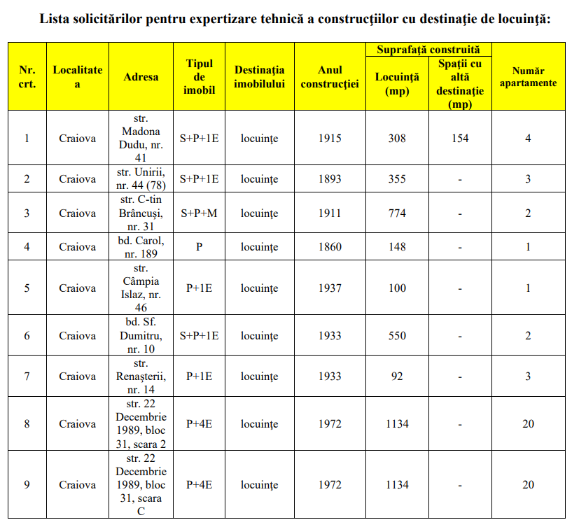 De mai mulți ani, Primăria Craiova a notificat cetățenii care locuiesc în clădiri vechi să le expertizeze tehnic cu privire la structura de rezistență, pentru a se afla cât de periculoase sunt în cazul unui cutremur serios. Termenul pentru expertizele tehnice în vederea încadrării acestora în clasă de risc seismic și a fundamentării măsurilor de intervenție, conform Legii nr. 170 din 7 octombrie 2019 pentru modificarea și completarea Ordonanței Guvernului nr. 20/1994 privind măsurile pentru reducerea riscului seismic al construcțiilor, a fost prorogat până la data de 1 iunie 2024.