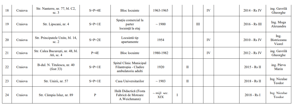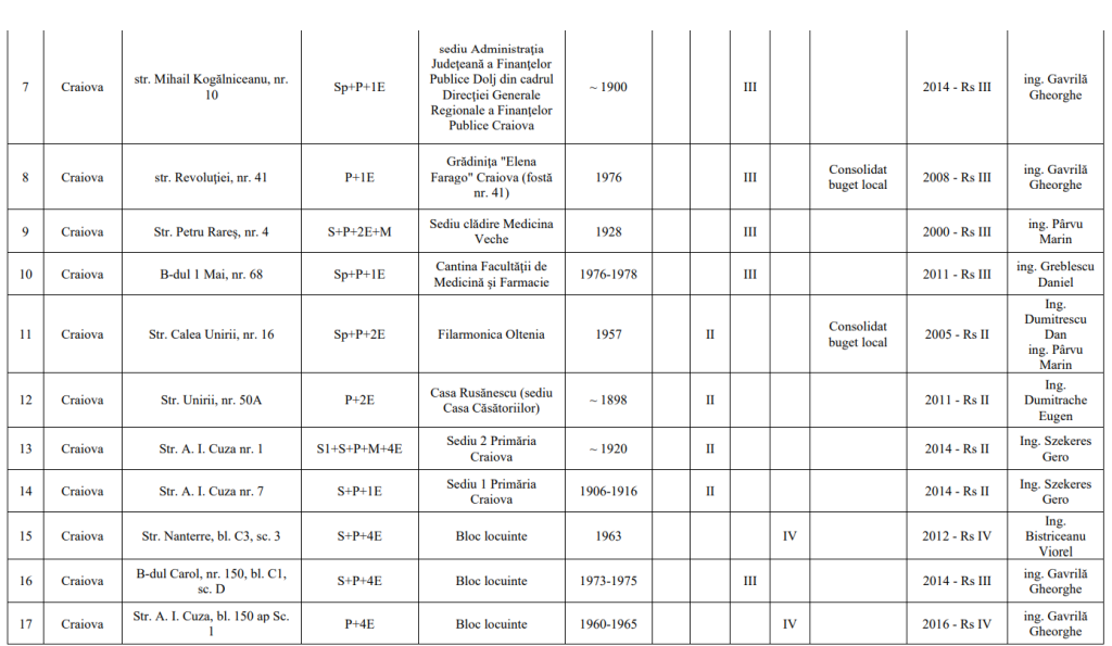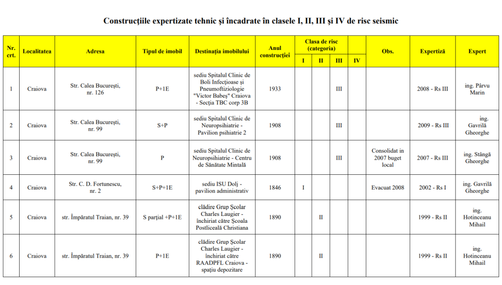În urmă cu doi ani, în Craiova erau făcute 28 de expertize tehnice, astfel: Cat. III – 9 clădiri, Cat. II – 8 clădiri, Cat. I – 6 clădiri, Cat. IV – 5 clădiri. Dintre acestea, doar nouă blocuri și două case au fost expertizate, restul de până la 28 de clădiri fiind instituții publice, după cum transmiteau reprezentanții Primăriei.