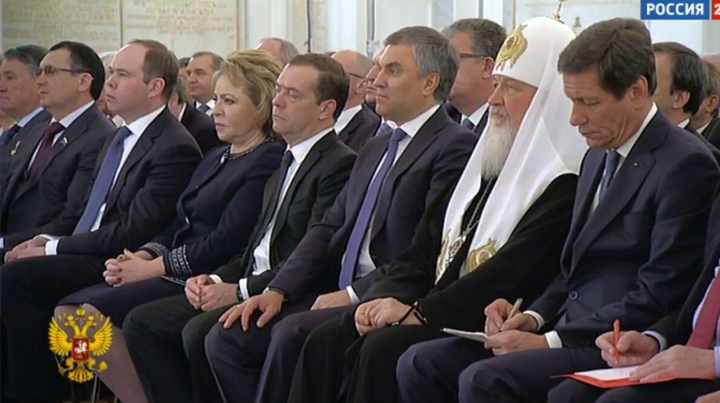 Dmitri Medvedev, aflat în primul rând, lângă patriarhul Kiril a fost surprins în timp ce părea furat de somn, scrie digi24.ro