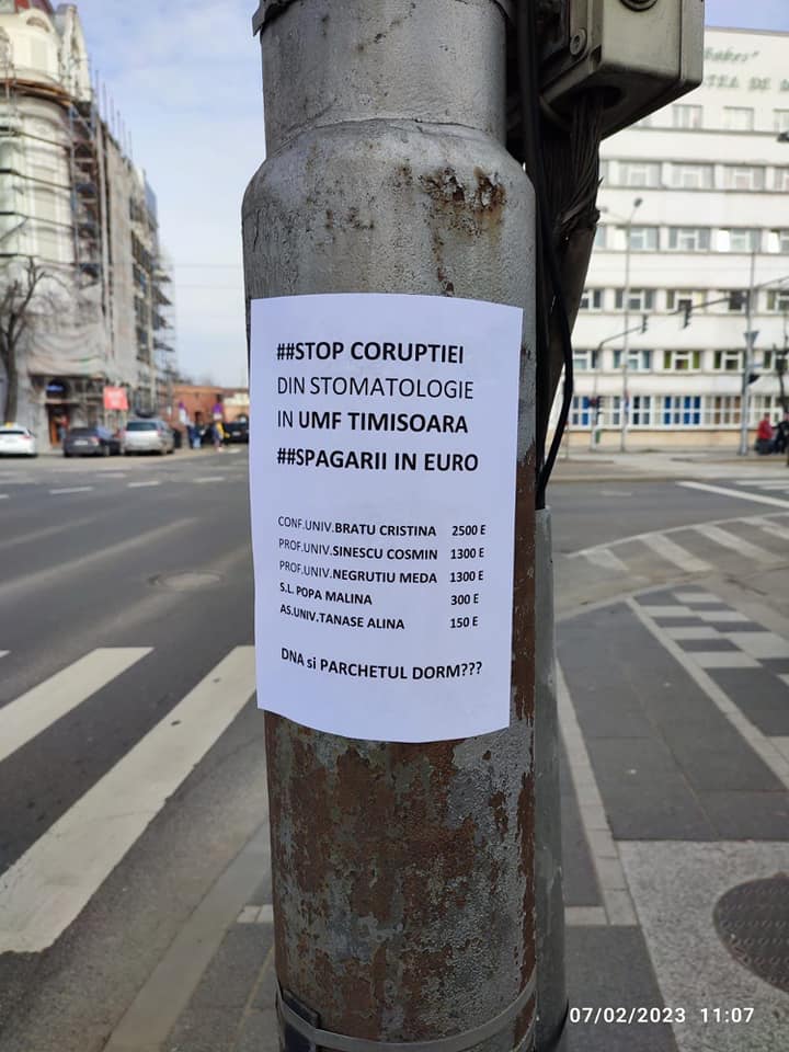Un nou scandal la Universitatea de Medicină și Farmaceutică (UMF) Timișoara: centrul orașului a fost împânzit cu afișe cu numele profesorilor acuzați că iau șpagă de la studenți, ca să-i treacă examenele, și tarifele pe care aceștia le-ar solicita.