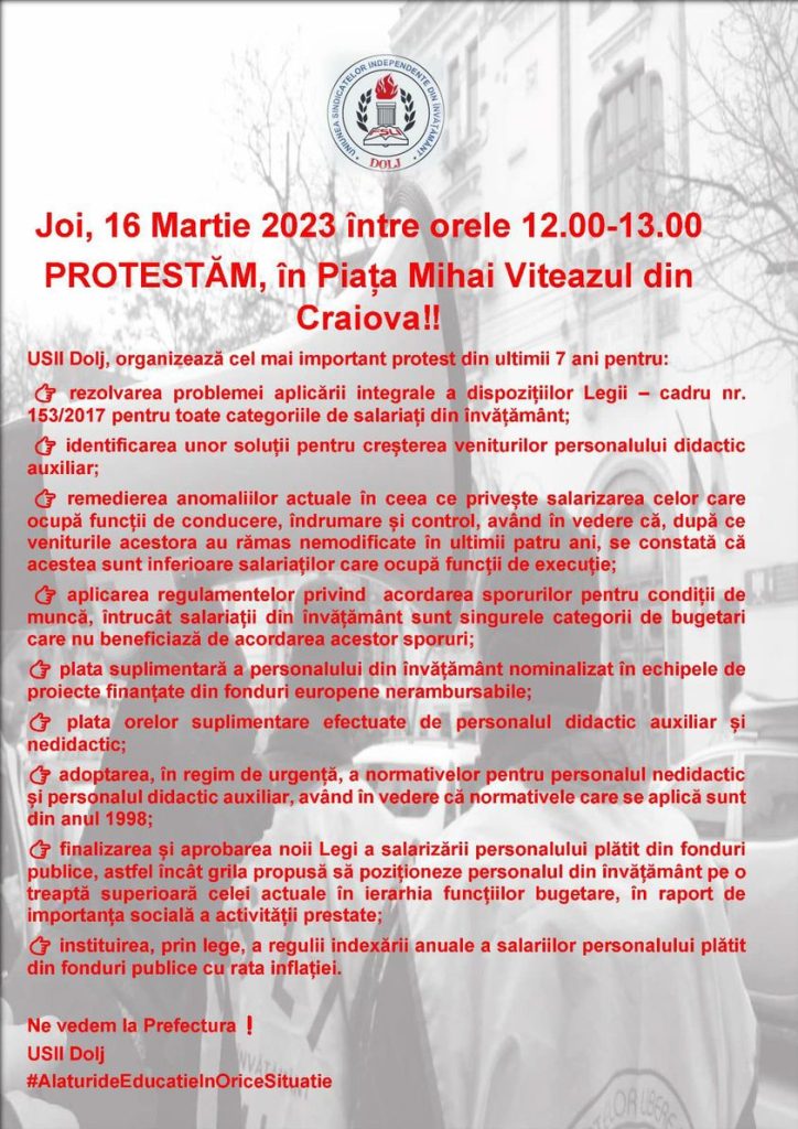 Uniunea Sindicatelor Independente din Învățământ Dolj vor să protesteze, joi, între orele 12:00 și 13:00, în Piața Mihai Viteazul, din Craiova. Acțiunea din Bănie este considerată cea cea mai importantă de agest tip, din ultimii 7 ani. În principal, protestele vor fi pentru aplicarea integrală a Legii salarizării, pentru toate categoriile de salariați din învățământ.