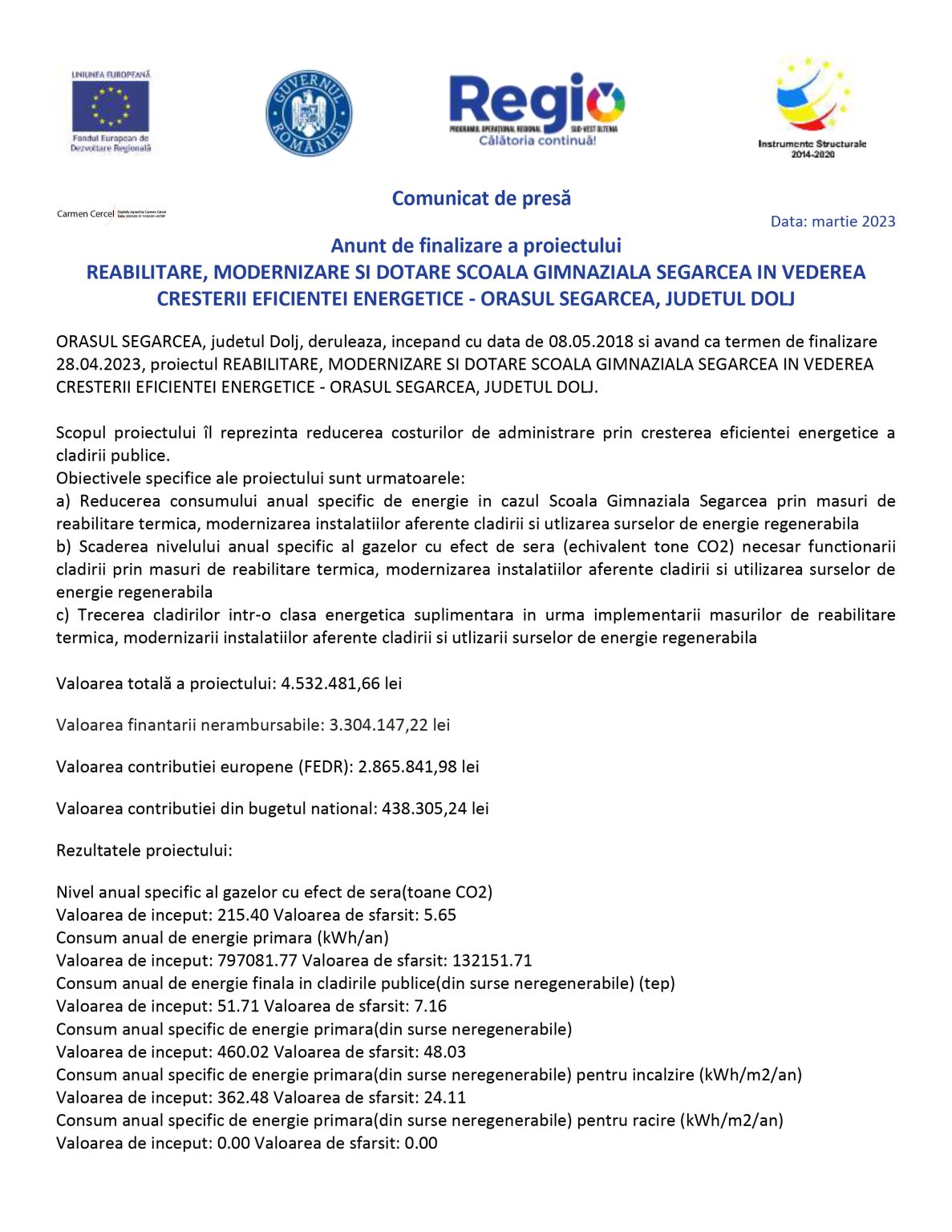 ActualitateEconomieAnunț de finalizare a proiectului REABILITARE, MODERNIZARE ȘI DOTARE ȘCOALA GIMNAZIALĂ SEGARCEA ÎN VEDEREA CREȘTERII EFICIENȚEI ENERGETICE – ORAȘUL SEGARCEA, JUDEȚUL DOLJ Jurnalul Olteniei 27 martie 2023 Share SHARE Jurnalul Olteniei See Full Bio Distribuie acest articol Facebook Whatsapp Whatsapp Email Copy Link Print Articolul precedent Avertizare de călătorie pentru Germania: Greve pe mai multe aeroporturi Articolul următor Baraj rupt, într-o comună din Dolj Ultima ora Se știe grupa în care poate juca România la Cupa Mondială din 2026 5 decembrie 2025 Dolj: Ajutoare sociale de peste 76 milioane lei 5 decembrie 2025 Cea de-a VII-a ediție a Semimaratonului Craiovei a avut loc sâmbătă, 18 octombrie 2025. 5 decembrie 2025 ANUNT PRIVIND ORGANIZAREA ACHIZITIEI DE UTILAJE . MINIEXCAVATOR – LOTUL 1, UTILAJ DE FORAT HIDRAULIC – LOTUL 2 – RELUATÃ 2 5 decembrie 2025 Modernizarea CF Filiași: Începe proiectarea 5 decembrie 2025 Testare gratuită HPV la Spitalul Județean Târgu Jiu 5 decembrie 2025 CE Oltenia raportează emisii scăzute de dioxid de carbon 5 decembrie 2025 DIICOT a destructurat un grup de proxenetism în Mehedinți 5 decembrie 2025 Legea pensiilor magistraților, atacată, din nou, la CCR 5 decembrie 2025 Magia Crăciunului Târgu Jiu: Seară de neuitat 5 decembrie 2025