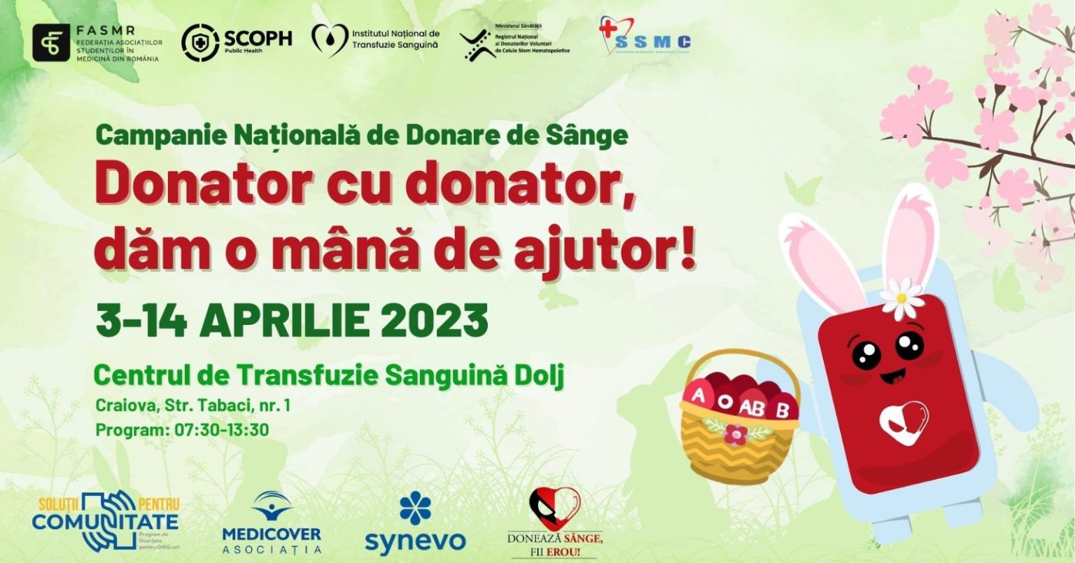 Echipa „Donează sânge, fii erou!” – Craiova organizează, în perioada 3-14 aprilie 2023, o campanie de donare de sânge la Centrul Regional de Transfuzie Sanguină Craiova, pe Strada Tabaci. Voluntarii proiectului vor fi prezenți la Centru de luni până vineri, între orele 8-14, asistând personalul și oferind mici atenții donatorilor.