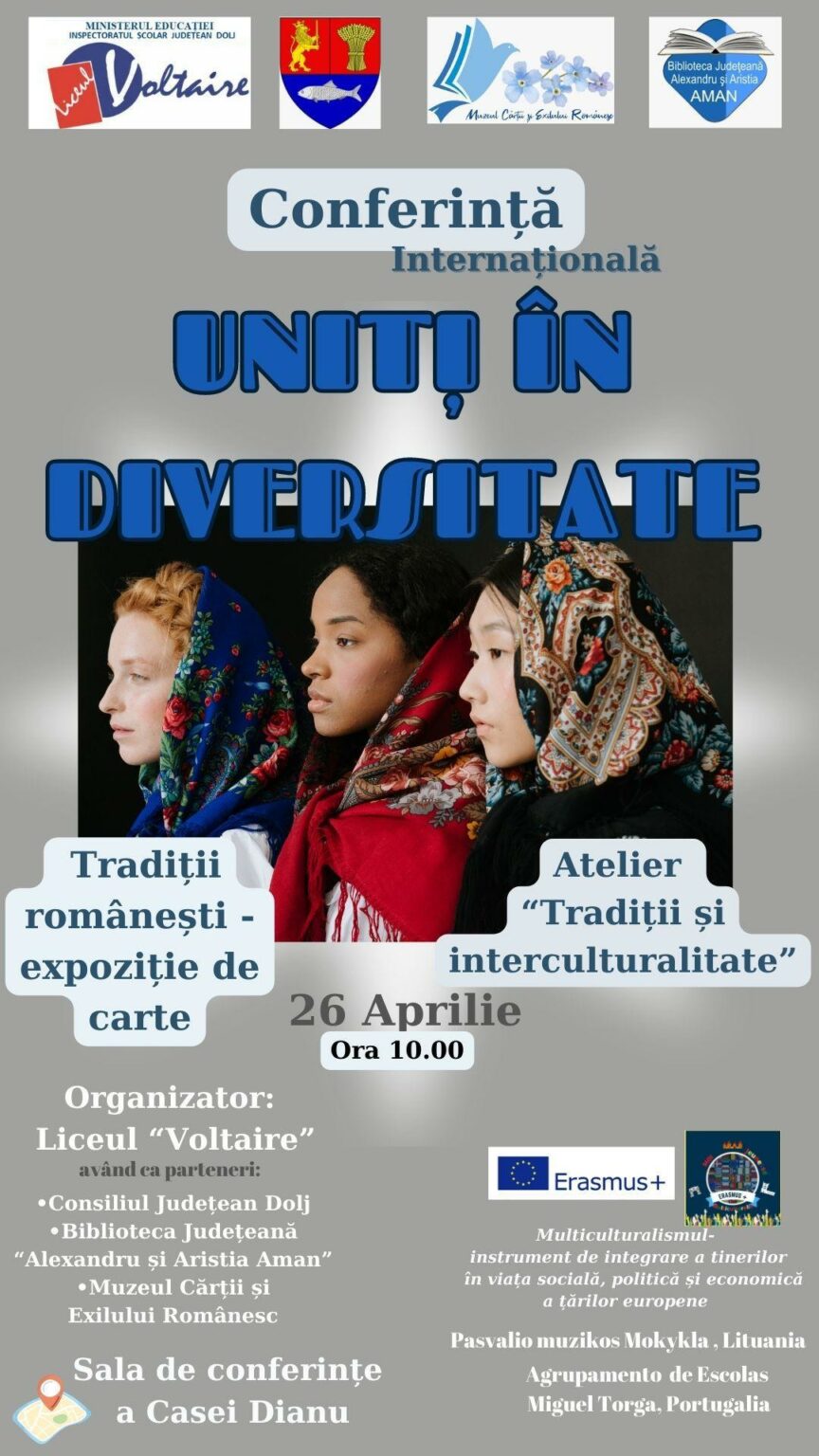 Biblioteca Județeană „Alexandru și Aristia Aman” găzduiește miercuri, 26 aprilie 2023, Conferința Internațională „Uniți în diversitate”, organizată de Liceul “Voltaire” la care vor participa invitați de prestigiu din ţară și străinătate.