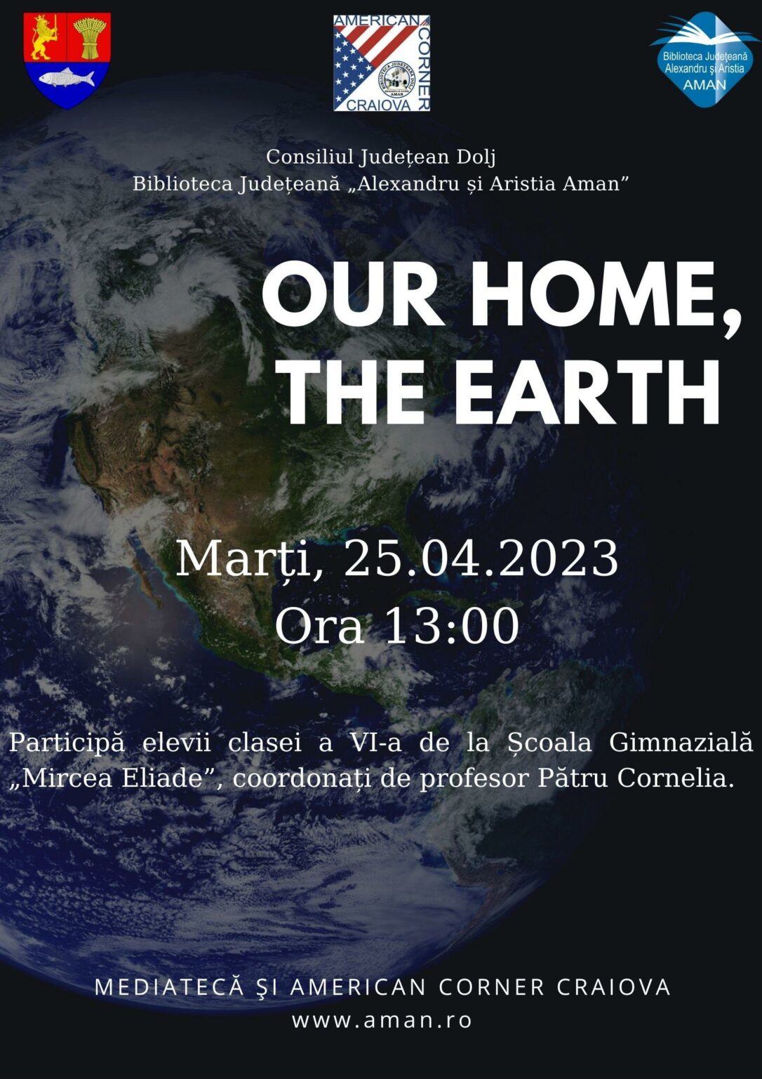 La evenimentul „Our Home, the Earth” vor participa elevii clasei a VI-a de la Școala Gimnazială „Mircea Eliade”, coordonați de profesor Pătru Cornelia. Elevii vor viziona filmul documentar „Waste Land”, urmat de o dezbatere pe tema protecției mediului înconjurător. Activitatea bibliotecii este înscrisă în cadrul campaniei internaționale coordonată la nivel global de platforma Earth Day (www.earthday.org). Campania este dedicată Zilei Pământului, care a fost sărbătorită în data de 22 aprilie.