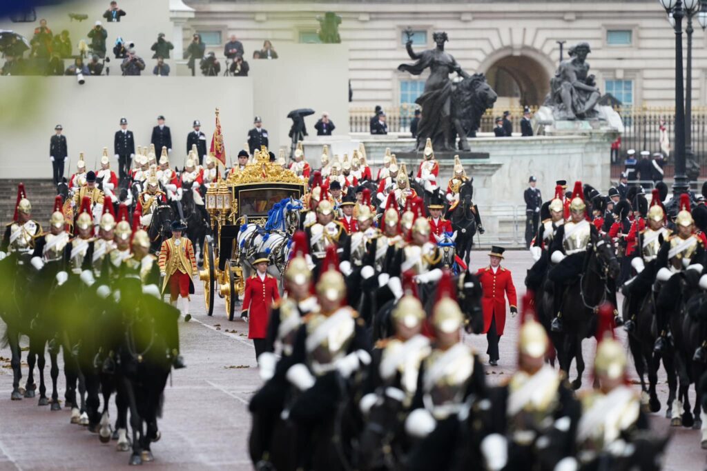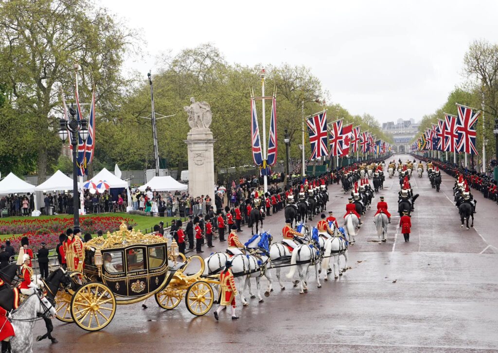 Regele și Regina au ajuns la Westminster Abbey pentru Serviciul de Încoronare, în jurul orei prânzului. Flancând ruta erau peste 1.000 de forțe armate din toate cele trei servicii și purtători standard ai Legiunii Regale Britanice, Servicii Civile în uniformă și organizații comunitare. Veteranii militari, SNH și asistenții sociale, reprezentanții organizațiilor caritabile și ai Forțelor Cadeților, toți au avut ocazia să vadă procesiunea.