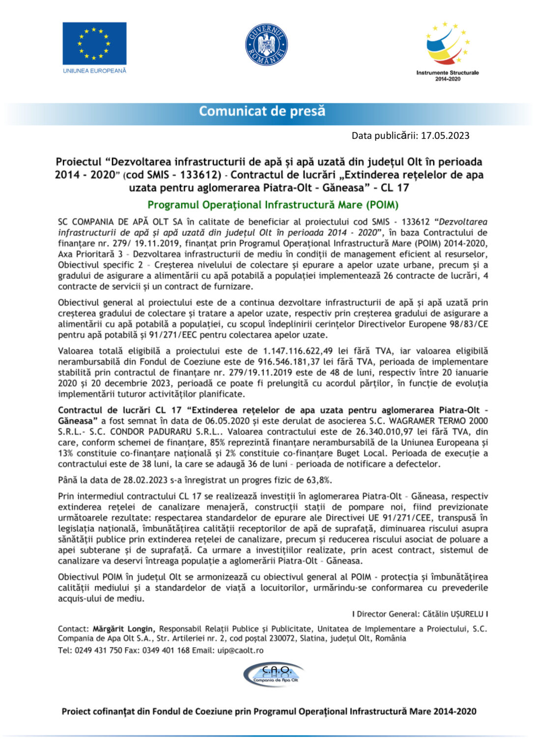 EconomieOltProiectul „Dezvoltarea infrastructurii de apă și apă uzată din județul Olt în perioada 2014 – 2020” (cod SMIS – 133612) – Contractul de lucrări „Extinderea rețelelor de apa uzata pentru aglomerarea Piatra-Olt – Găneasa” – CL 17 Jurnalul Olteniei 16 mai 2023 Share SHARE Jurnalul Olteniei See Full Bio Distribuie acest articol Facebook Whatsapp Whatsapp Email Copy Link Print Articolul precedent Percheziții la contrabandiști de țigări Articolul următor Joao Janeiro, descris drept antrenorul ideal pentru FCU Craiova: „Nu prea acceptă multe lucruri” Ultima ora Se știe grupa în care poate juca România la Cupa Mondială din 2026 5 decembrie 2025 Dolj: Ajutoare sociale de peste 76 milioane lei 5 decembrie 2025 Cea de-a VII-a ediție a Semimaratonului Craiovei a avut loc sâmbătă, 18 octombrie 2025. 5 decembrie 2025 ANUNT PRIVIND ORGANIZAREA ACHIZITIEI DE UTILAJE . MINIEXCAVATOR – LOTUL 1, UTILAJ DE FORAT HIDRAULIC – LOTUL 2 – RELUATÃ 2 5 decembrie 2025 Modernizarea CF Filiași: Începe proiectarea 5 decembrie 2025 Testare gratuită HPV la Spitalul Județean Târgu Jiu 5 decembrie 2025 CE Oltenia raportează emisii scăzute de dioxid de carbon 5 decembrie 2025 DIICOT a destructurat un grup de proxenetism în Mehedinți 5 decembrie 2025 Legea pensiilor magistraților, atacată, din nou, la CCR 5 decembrie 2025 Magia Crăciunului Târgu Jiu: Seară de neuitat 5 decembrie 2025