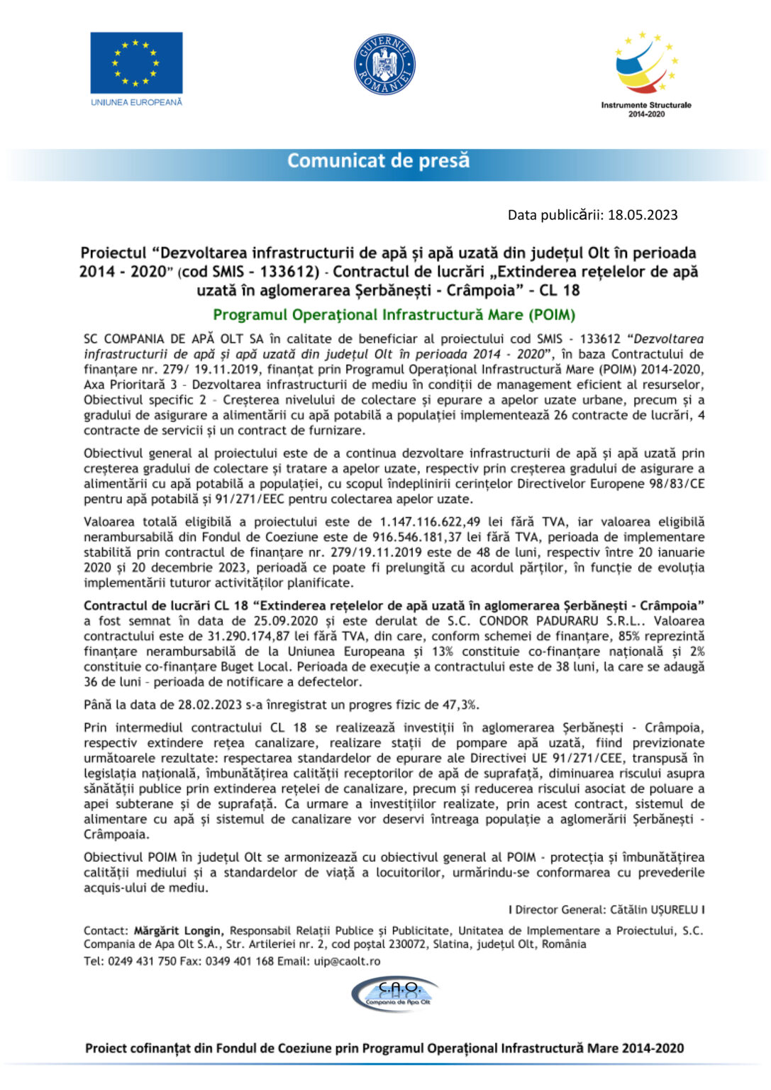 Proiectul „Dezvoltarea infrastructurii de apă și apă uzată din județul Olt în perioada 2014 – 2020” (cod SMIS – 133612) – Contractul de lucrări „Extinderea rețelelor de apă uzată în aglomerarea Șerbănești – Crâmpoia” – CL 18