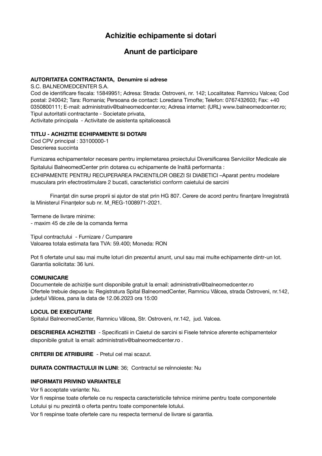 Achizitie echipamente si dotari. Anunt de participare