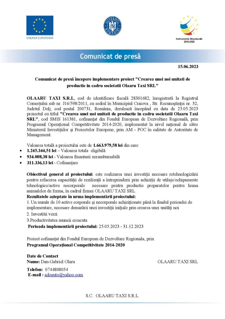 DoljEconomieComunicat de presă începere implementare proiect „Crearea unei noi unitati de productie in cadru societatii Olaaru Taxi SRL” Jurnalul Olteniei 27 octombrie 2023 Share SHARE Jurnalul Olteniei See Full Bio Distribuie acest articol Facebook Whatsapp Whatsapp Email Copy Link Print Articolul precedent Meteorologii au emis trei coduri de ploi torențiale. Oltenia, vizată Articolul următor România va extrage gaze din Marea Neagră la sfârşitul anului 2026 Ultima ora Se știe grupa în care poate juca România la Cupa Mondială din 2026 5 decembrie 2025 Dolj: Ajutoare sociale de peste 76 milioane lei 5 decembrie 2025 Cea de-a VII-a ediție a Semimaratonului Craiovei a avut loc sâmbătă, 18 octombrie 2025. 5 decembrie 2025 ANUNT PRIVIND ORGANIZAREA ACHIZITIEI DE UTILAJE . MINIEXCAVATOR – LOTUL 1, UTILAJ DE FORAT HIDRAULIC – LOTUL 2 – RELUATÃ 2 5 decembrie 2025 Modernizarea CF Filiași: Începe proiectarea 5 decembrie 2025 Testare gratuită HPV la Spitalul Județean Târgu Jiu 5 decembrie 2025 CE Oltenia raportează emisii scăzute de dioxid de carbon 5 decembrie 2025 DIICOT a destructurat un grup de proxenetism în Mehedinți 5 decembrie 2025 Legea pensiilor magistraților, atacată, din nou, la CCR 5 decembrie 2025 Magia Crăciunului Târgu Jiu: Seară de neuitat 5 decembrie 2025