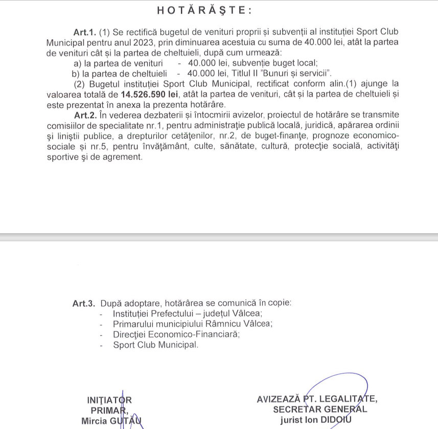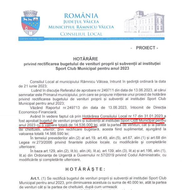 Conform Hotărârii Consiliului Local Râmnicu Vâlcea Nr. 17 din 31.01.2023, proiect inițiat de primarul Mircia Gutău și aprobat în unanimitate de aleșii municipiului, bugetul Sport Club Municipal (SCM) Râmnicu Vâlcea pentru anul 2023 este de 14,536 milioane de lei. Adică aproximativ 2,9 milioane de euro! Doar din banii publici ai Râmnicului. Detaliul a fost încă o dată scos în evidență de un proiect de hotărâre (punctul 2 pe ordinea de zi) aflat pe masa aleșilor la ședința ordinară a CL Râmnicu Vâlcea de miercuri, 21 iunie.