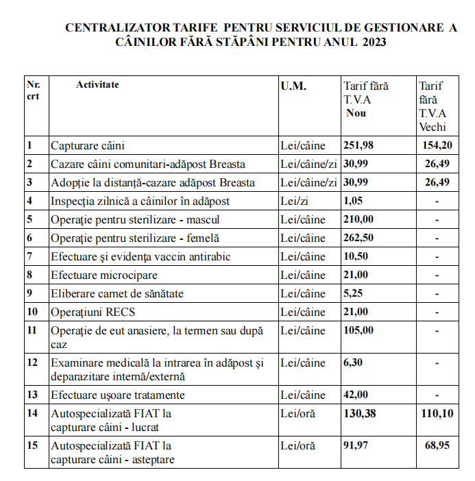 Potrivit centralizatorului de tarife publicat în raportul de specialitate, taxa de capturare va înregistra o creștere de aproape 100 de lei. Totodată, sunt ceruți bani mai mulți și pentru cazarea câinilor comunitari în adăpost Breasta, dar și pentru capitolul „Adopție la distanță-cazare adăpost Breasta”.