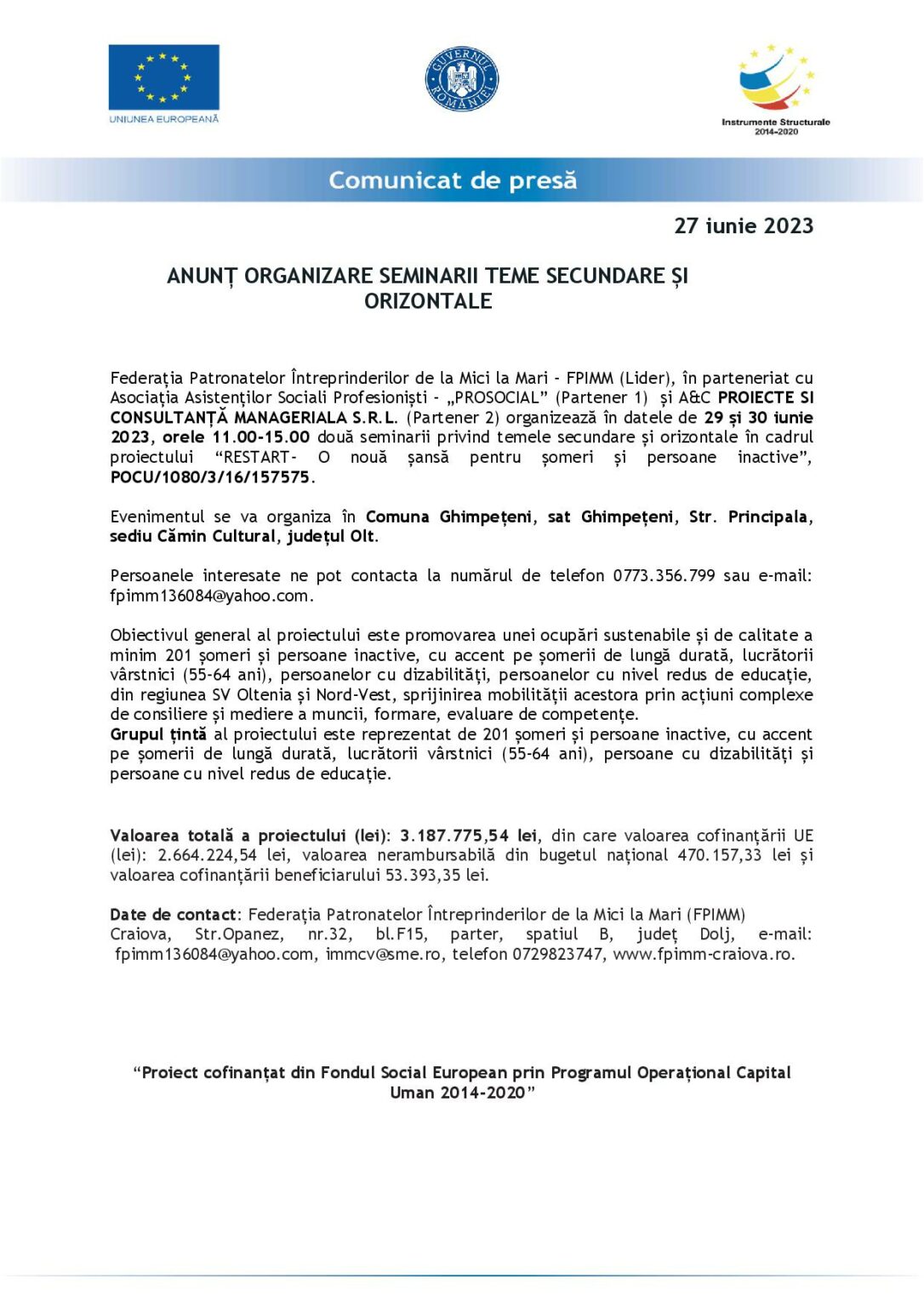 ANUNȚ ORGANIZARE SEMINARII TEME SECUNDARE ȘI ORIZONTALE