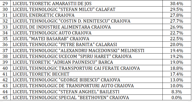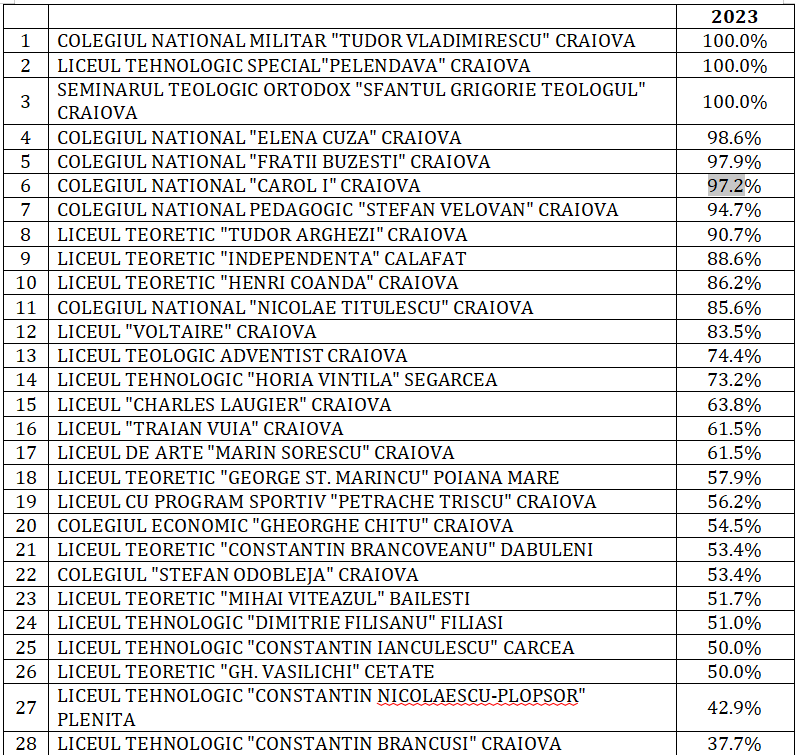 Colegiul Național Militar „Tudor Vladimirescu”, Liceul Tehnologic Special „Pelendava” și Seminarul Tologic Ortodox „Sfântul Grigorie Teologul”, din Craiova, au înregistrat o promovabilitate de 100%. Aceste unități de învățământ au fost urmate de Colegiul Național „Elena Cuza”, cu o promovabilitate de 98.6%, Colegiul Național „Frații Buzești”, cu 97.9% sau Colegiul Național „Carol I”, cu 97.2%.