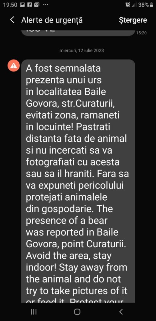 INFORMAȚIA INIȚIALĂ! Miercuri (12 iulie) seară, pe raza stațiunii vâlcene Băile Govora a fost semnalată prezența unui urs. Autoritățile au și emis o avertizare locală prin sistemul Ro-Alert în acest sens. La nivel național, în aceeași zi, 23 de alerte similare au fost emise în mai multe județe.