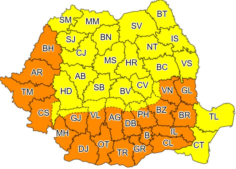 Judeţele aflate sub Cod portocaliu de caniculă sunt: Bihor, Arad, Timiş, Caraş Severin, Mehedinţi, Gorj, Vâlcea, Argeş, Dâmboviţa, Prahova, Buzău, Vrancea, Galaţi, Dolj, Olt, Teleorman, Giurgiu, Călăraşi, Ialomiţa, Brăila, precum şi municipiul Bucureşti.
