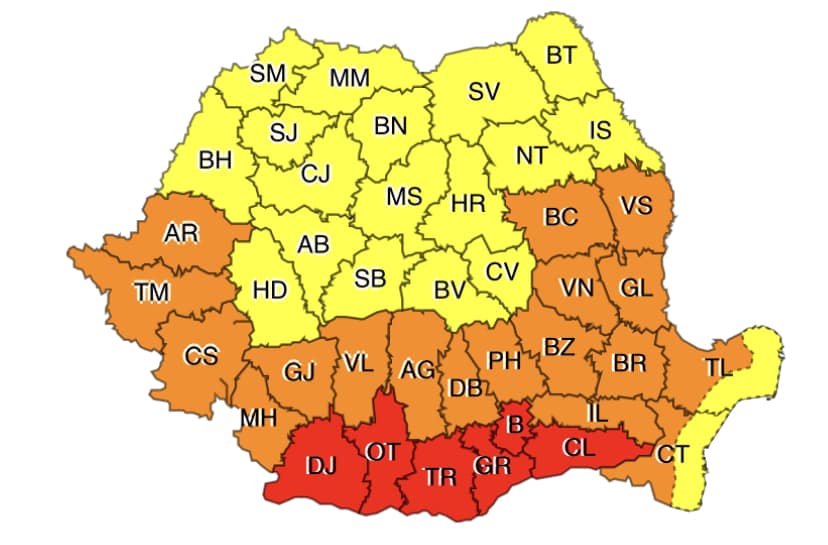 Temperaturile vor crește în zilele următoare până la 42 de grade Celsius, avertizează meteorologii, care au emis mai multe avertizări cod roșu, portocaliu și galben pentru val de căldură, caniculă și disconfort termic ridicat.