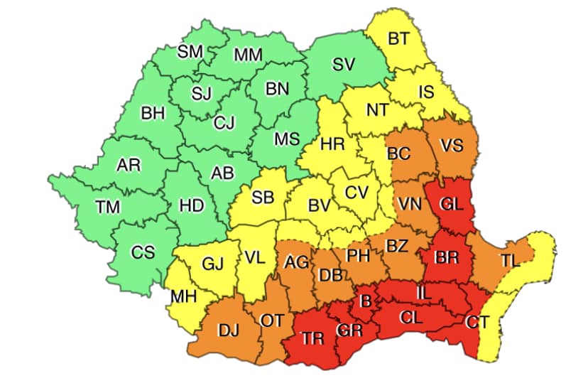 Miercuri, în sudul Olteniei, nordul Munteniei, nord-vestul Dobrogei și în centrul și sud-vestul Moldovei va fi cod portocaliu de caniculă și se vor înregistra temperaturi maxime în general de 37…39 de grade, astfel că disconfortul termic va fi accentuat. Indicele temperatură-umezeală (ITU) va depăși pragul critic de 80 de unități.