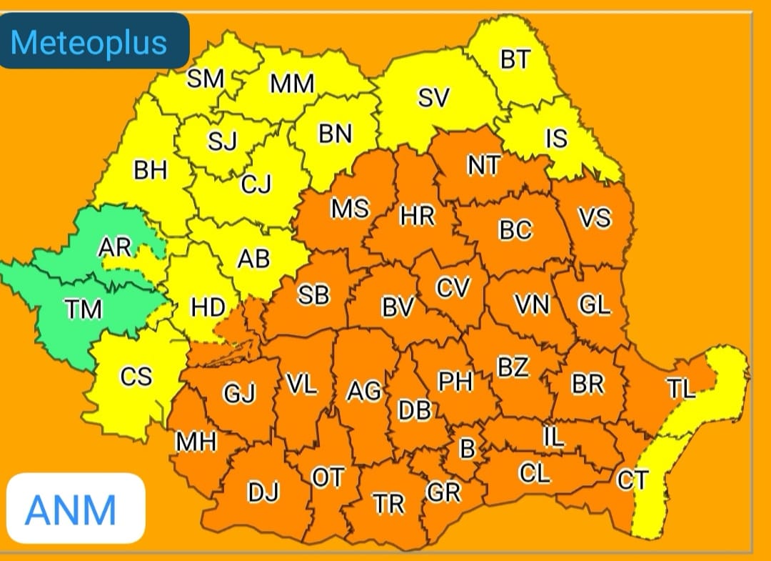 Astfel, de miercuri, de la ora 10.00, până joi, la ora 2.00, este Cod portocaliu de instabilitate atmosferică accentuată, intensificări ale vântului, vijelii puternice, în judeţele Olt, Gorj, Mehedinţi, Dolj, Vâlcea, Mureş, Harghita, Neamţ, Bacău, Vaslui, Galaţi, Vrancea, Covasna, Braşov, Sibiu, Argeş, Teleorman, Giurgiu, Dâmboviţa, Prahova, Buzău, Brăila, Ialomiţa, Călăraşi şi municipiul Bucureşti, precum şi, parţial, în Tulcea, Constanţa, Alba şi Hunedoara.