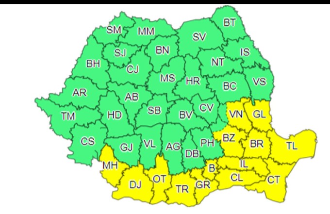 De asemenea, a fost emis un cod galben, vizând intensificări ale vântului şi instabilitate atmosferică temporar accentuată, va fi în vigoare joi, între orele 2.00 şi 10.00, în Mehedinţi, Dolj, Olt, Teleorman, Giurgiu, Călăraşi, Ialomiţa, Buzău, Brăila, Vrancea, Galaţi, Tulcea, Constanţa şi în Bucureşti.