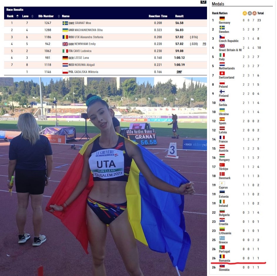 O singură medalie și locul 26 din 28 de țări care au obținut medalii și 48 participante în total, bilanț mai degrabă amar al delegației României la Campionatul European J1 (U20) desfășurat la Ierusalim (Israel) în perioada 7-10 august. Deși nu a împlinit încă 16 ani (e născută în octombrie 2007), vâlceanca Alexandra Ștefania Uță, antrenată de profesoara Alina Gabriela Enescu, a reușit joi seară (10 august) să obțină unica medalie pentru țara noastră de la această competiție, bronzul în proba de 400 metri garduri. La fel ca aproape toți sportivii români care au participat, cu o săptămână înainte, la Festivalul Olimpic al Tineretului European (cu vârste de sub 18 ani) de la Maribor, și copilul minune al Vâlcii și al atletismului național s-a luptat în cele trei zile de competiție cu simptomele unei enervante infecții respiratorii căpătate în cursa aeriană cu care s-au întors din Slovenia.