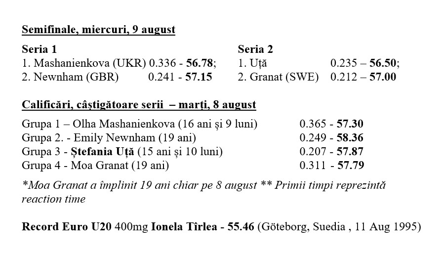 Așa cum deja ne-a obișnuit, în finală, talentata și ambițioasa atletă pregătită de profesoara Alina Gabriela Enescu a reușit un final electrizant de cursă, smulgând practic medalia de bronz de pe pieptul atletei britanice Emily Newnham, pe split decision, dar fără dubii după consultarea fotofinish-ului și a timpilor detaliați. În ierarhia mondială a probei de 400 m garduri, Ștefi Uță ocupă deja locul 46, peste atlete mult mai experimentate.
