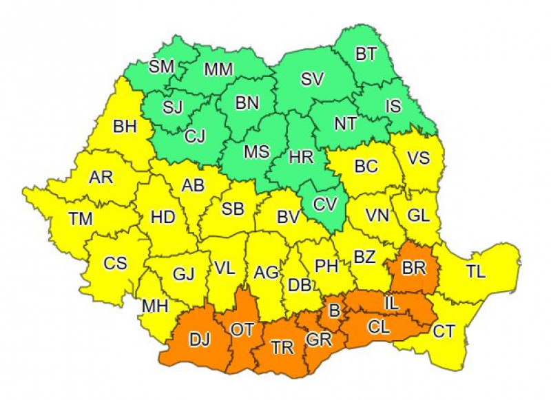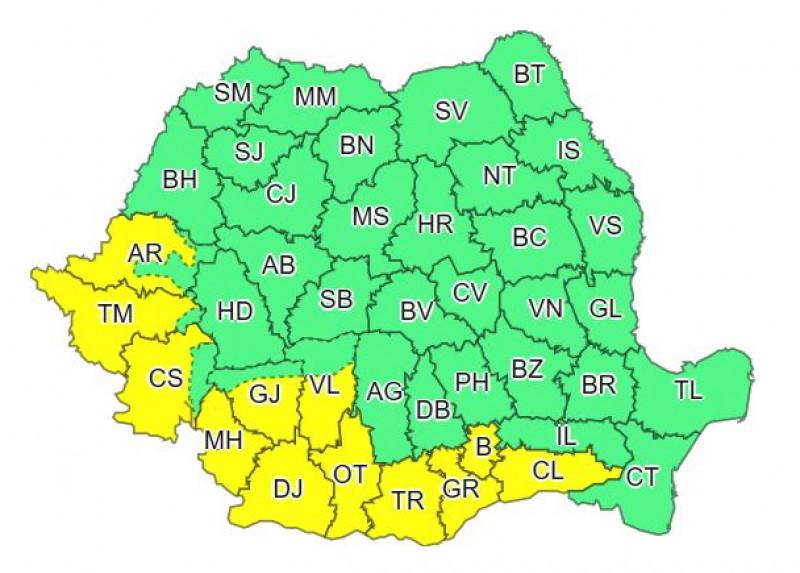 Totodată, un Cod galben de caniculă şi disconfort termic va afecta, pe parcursul zilei de miercuri, zone din Banat, Crişana, sudul Transilvaniei, Oltenia, Muntenia, Dobrogea şi jumătatea sudică a Moldovei. Disconfortul termic va fi ridicat, iar indicele temperatură-umezeală (ITU) va depăşi pragul critic de 80 de unităţi.