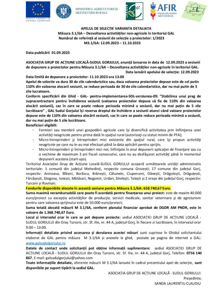 AnunturiGorjAPELUL DE SELECȚIE VARIANTA DETALIATA Măsura 3.1/6A – Dezvoltarea activităților non-agricole în teritoriul GAL. Numărul de referință al sesiunii de selecție a proiectelor: 1/2023M3.1/6A: 12.09.2023 – 11.10.2023 Jurnalul Olteniei 16 octombrie 2023 Share SHARE Jurnalul Olteniei See Full Bio Distribuie acest articol Facebook Whatsapp Whatsapp Email Copy Link Print Articolul precedent APELUL DE SELECȚIE VARIANTA SIMPLIFICATĂM 2.2/2B „Acces facil în domeniul agricol al unor fermieri calificați și reînnoirea generațiilor” Articolul următor VIDEO. Accident cu autotren condus de un șofer turc pe DN 7 la Brezoi Ultima ora Se știe grupa în care poate juca România la Cupa Mondială din 2026 5 decembrie 2025 Dolj: Ajutoare sociale de peste 76 milioane lei 5 decembrie 2025 Cea de-a VII-a ediție a Semimaratonului Craiovei a avut loc sâmbătă, 18 octombrie 2025. 5 decembrie 2025 ANUNT PRIVIND ORGANIZAREA ACHIZITIEI DE UTILAJE . MINIEXCAVATOR – LOTUL 1, UTILAJ DE FORAT HIDRAULIC – LOTUL 2 – RELUATÃ 2 5 decembrie 2025 Modernizarea CF Filiași: Începe proiectarea 5 decembrie 2025 Testare gratuită HPV la Spitalul Județean Târgu Jiu 5 decembrie 2025 CE Oltenia raportează emisii scăzute de dioxid de carbon 5 decembrie 2025 DIICOT a destructurat un grup de proxenetism în Mehedinți 5 decembrie 2025 Legea pensiilor magistraților, atacată, din nou, la CCR 5 decembrie 2025 Magia Crăciunului Târgu Jiu: Seară de neuitat 5 decembrie 2025