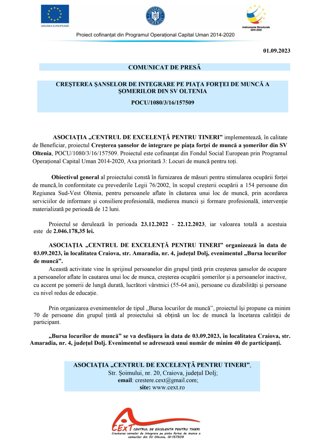 AnunturiCreșterea șanselor de integrare pe piața forței de muncă a șomerilor din SV Oltenia – POCU/1080/3/16/157509 Jurnalul Olteniei 3 noiembrie 2023 Share SHARE Jurnalul Olteniei See Full Bio Distribuie acest articol Facebook Whatsapp Whatsapp Email Copy Link Print Articolul precedent VIDEO. Accident cu autotren condus de un șofer turc pe DN 7 la Brezoi Articolul următor A murit Răzvan Gorcinski, fostul toboșar al trupei Proconsul Ultima ora Se știe grupa în care poate juca România la Cupa Mondială din 2026 5 decembrie 2025 Dolj: Ajutoare sociale de peste 76 milioane lei 5 decembrie 2025 Cea de-a VII-a ediție a Semimaratonului Craiovei a avut loc sâmbătă, 18 octombrie 2025. 5 decembrie 2025 ANUNT PRIVIND ORGANIZAREA ACHIZITIEI DE UTILAJE . MINIEXCAVATOR – LOTUL 1, UTILAJ DE FORAT HIDRAULIC – LOTUL 2 – RELUATÃ 2 5 decembrie 2025 Modernizarea CF Filiași: Începe proiectarea 5 decembrie 2025 Testare gratuită HPV la Spitalul Județean Târgu Jiu 5 decembrie 2025 CE Oltenia raportează emisii scăzute de dioxid de carbon 5 decembrie 2025 DIICOT a destructurat un grup de proxenetism în Mehedinți 5 decembrie 2025 Legea pensiilor magistraților, atacată, din nou, la CCR 5 decembrie 2025 Magia Crăciunului Târgu Jiu: Seară de neuitat 5 decembrie 2025