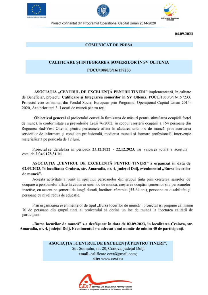 AnunturiCalificare și integrarea șomerilor în SV Oltenia – POCU/1080/3/16/157233 Jurnalul Olteniei 3 noiembrie 2023 Share SHARE Jurnalul Olteniei See Full Bio Distribuie acest articol Facebook Whatsapp Whatsapp Email Copy Link Print Articolul precedent Aurelian Chițu, idol la FCU Craiova: „E un lucru frumos ca fanii să îți strige numele” Articolul următor A plouat cu sancțiuni pentru șoferii indisciplinați Ultima ora Sfântul Nicolae: 800.000 de români sărbătoriți pe 6 decembrie 6 decembrie 2025 Zilele Colindului în România: Tradiția care unește țara 6 decembrie 2025 Se știe grupa în care poate juca România la Cupa Mondială din 2026 5 decembrie 2025 Dolj: Ajutoare sociale de peste 76 milioane lei 5 decembrie 2025 Cea de-a VII-a ediție a Semimaratonului Craiovei a avut loc sâmbătă, 18 octombrie 2025. 5 decembrie 2025 ANUNT PRIVIND ORGANIZAREA ACHIZITIEI DE UTILAJE . MINIEXCAVATOR – LOTUL 1, UTILAJ DE FORAT HIDRAULIC – LOTUL 2 – RELUATÃ 2 5 decembrie 2025 Modernizarea CF Filiași: Începe proiectarea 5 decembrie 2025 Testare gratuită HPV la Spitalul Județean Târgu Jiu 5 decembrie 2025 CE Oltenia raportează emisii scăzute de dioxid de carbon 5 decembrie 2025 DIICOT a destructurat un grup de proxenetism în Mehedinți 5 decembrie 2025