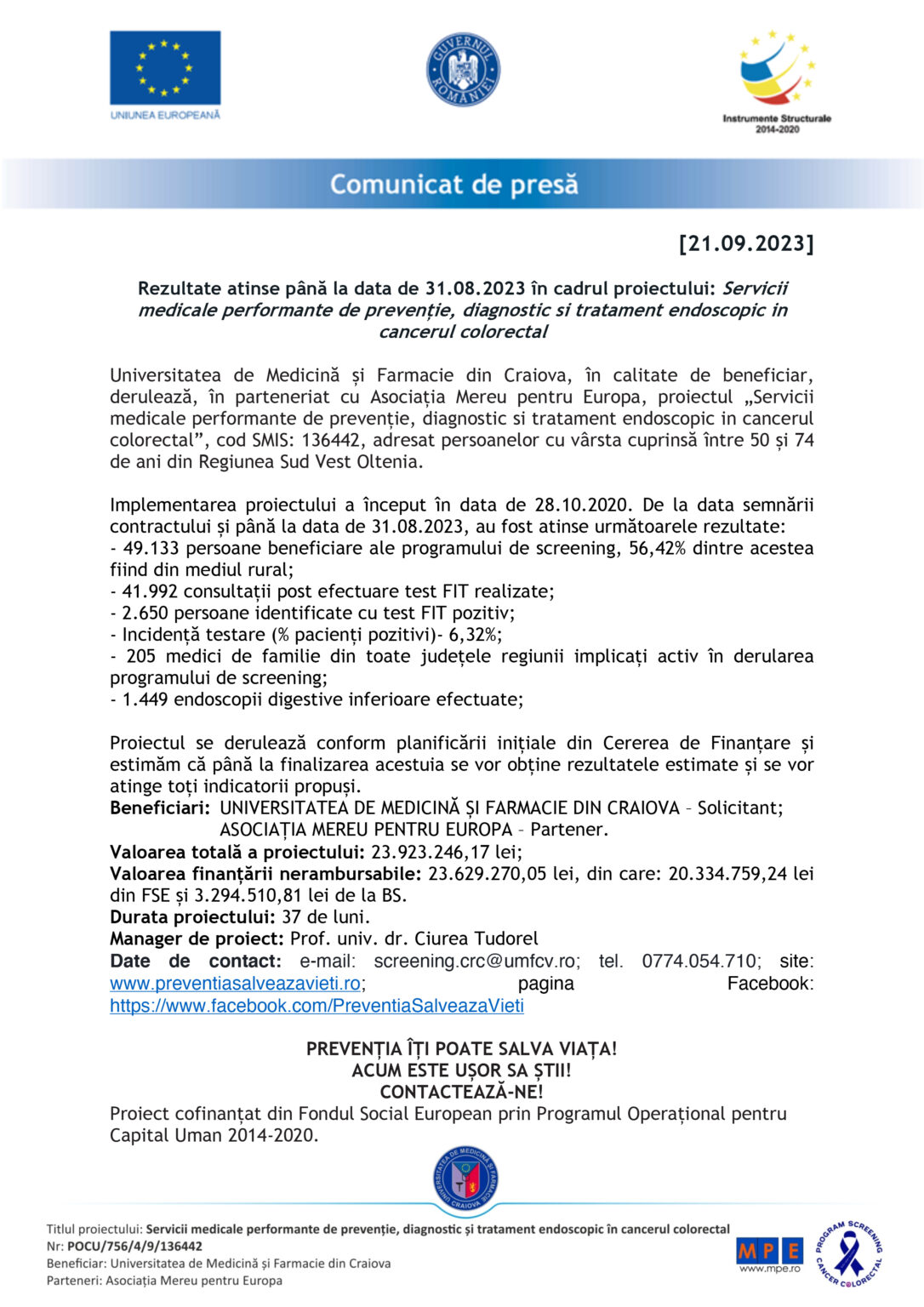 ActualitateAnunturiDoljRezultate atinse până la data de 31.08.2023 în cadrul proiectului: Servicii medicale performante de prevenție, diagnostic și tratament endoscopic în cancerul colorectal Jurnalul Olteniei 26 septembrie 2023 Share SHARE Jurnalul Olteniei See Full Bio Distribuie acest articol Facebook Whatsapp Whatsapp Email Copy Link Print Articolul precedent De ce apare deformarea tălpii la adulți Articolul următor VIDEO/ Un traficant de Oxicodonă și Fentanil, prins în flagrant de DIICOT Ultima ora Sorana Cîrstea a anunțat că se retrage din tenis 7 decembrie 2025 Jurnalit.com: Gérard Piqué laudă România: „Noua Carolina de Nord” 6 decembrie 2025 Spargere de sezon: doi doljeni au fugit cu sania! 6 decembrie 2025 Restricțiile de pe DN7, Viaductul Cârligul Mic, ridicate 6 decembrie 2025 Incendiu puternic în Malu Mare: Pompierii intervin 6 decembrie 2025 Scandal în Gorj: Doi tineri reținuți după o bătaie 6 decembrie 2025 Sfântul Nicolae: 800.000 de români sărbătoriți pe 6 decembrie 6 decembrie 2025 Zilele Colindului în România: Tradiția care unește țara 6 decembrie 2025 Se știe grupa în care poate juca România la Cupa Mondială din 2026 5 decembrie 2025 Dolj: Ajutoare sociale de peste 76 milioane lei 5 decembrie 2025