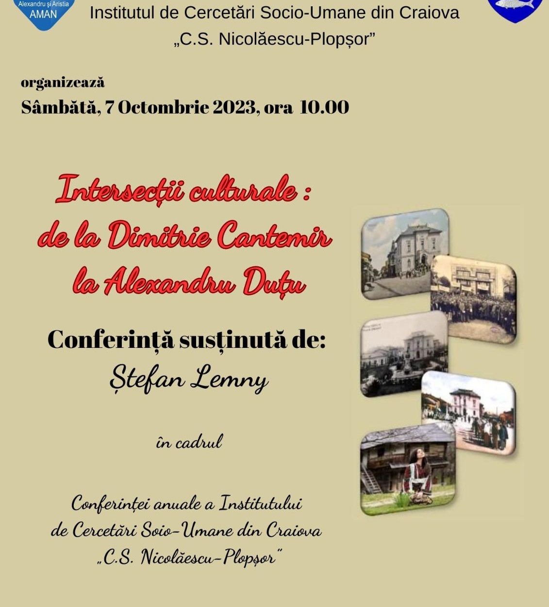 Conferința „Intersecții culturale: de la Dimitrie Cantemir la Alexandru Duțu, face parte din Conferința anuală a Institutul de Cercetări Socio-Umane din Craiova „C. S. Nicolăescu – Plopșor, desfășurată la Craiova, în perioada 5 – 7 octombrie 2023.