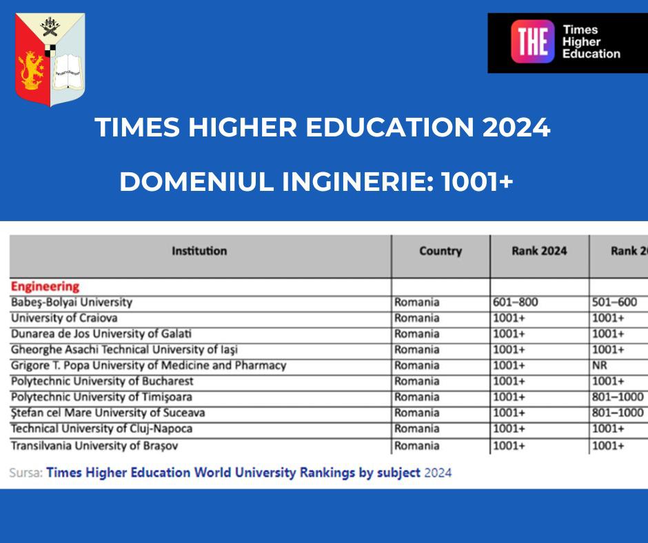 • Domeniul Inginerie: 1001+  (sunt 9 universități din România în acest interval și doar o universitate din România este mai bine clasificată);
