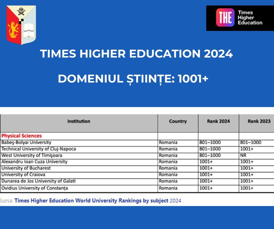 • Domeniul Științe: 1001+  (sunt 5 universități din România în acest interval și doar 3 universități din România sunt mai bine clasificate în intervalul 801-1000);