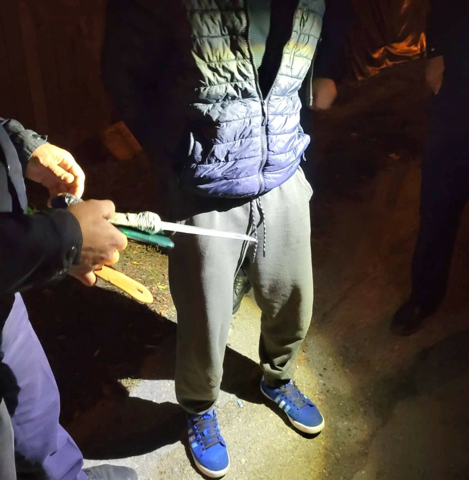 În urma controlului corporal efectuat asupra bărbatului, a fost găsit un obiect tăietor-înțepător cu lama de cca. 30 cm. Persoana în cauză a fost predată organelor de urmărire penală pentru continuarea cercetărilor.