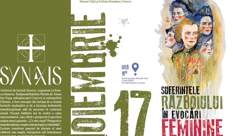 Facultatea de Teologie Ortodoxă din Craiova organizează, vineri, 17 noiembrie a.c., începând cu ora 16, la Sala de expoziție „Ritmurile vieții” – Casa Băniei din Craiova, cea de-a doua conferință a Atelierului Synaxis, intitulată „Suferințele războiului în evocări feminine”.