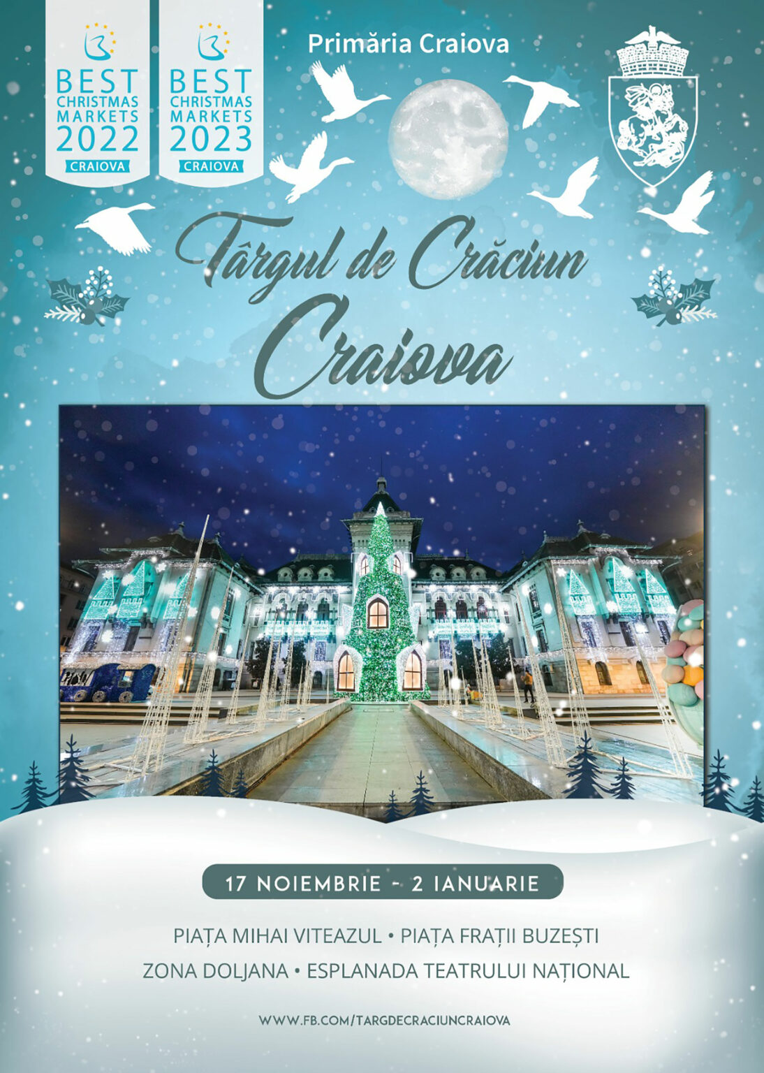 Târgul de Crăciun din Craiova se desfășoară în perioada 17 noiembrie 2023 – 2 ianuarie 2024, în patru zone din municipiu – Centrul Vechi, Piaţa William Shakespeare, zona Doljana şi Piața Mihai Viteazul, acolo unde vizitatorii o pot întâlni pe Crăiasa Zăpezii, se pot urca în cea mai mare roată panoramică din România sau îşi pot face poze la căsuțele unicat, magic pictate de artişti plastici.