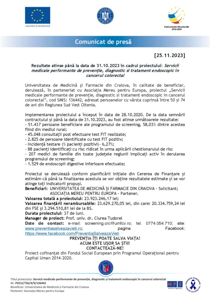 AnunturiDoljRezultate atinse până la data de 31.10.2023 în cadrul proiectului: Servicii medicale performante de prevenție, diagnostic si tratament endoscopic in cancerul colorectal Jurnalul Olteniei 27 noiembrie 2023 Share SHARE Jurnalul Olteniei See Full Bio Distribuie acest articol Facebook Whatsapp Whatsapp Email Copy Link Print Articolul precedent Biletul zilei (25 noiembrie): Cotă peste 8! Articolul următor 17 israelieni și thailandezi eliberați de Hamas au ajuns în Israel Ultima ora Zilele Colindului în România: Tradiția care unește țara 6 decembrie 2025 Se știe grupa în care poate juca România la Cupa Mondială din 2026 5 decembrie 2025 Dolj: Ajutoare sociale de peste 76 milioane lei 5 decembrie 2025 Cea de-a VII-a ediție a Semimaratonului Craiovei a avut loc sâmbătă, 18 octombrie 2025. 5 decembrie 2025 ANUNT PRIVIND ORGANIZAREA ACHIZITIEI DE UTILAJE . MINIEXCAVATOR – LOTUL 1, UTILAJ DE FORAT HIDRAULIC – LOTUL 2 – RELUATÃ 2 5 decembrie 2025 Modernizarea CF Filiași: Începe proiectarea 5 decembrie 2025 Testare gratuită HPV la Spitalul Județean Târgu Jiu 5 decembrie 2025 CE Oltenia raportează emisii scăzute de dioxid de carbon 5 decembrie 2025 DIICOT a destructurat un grup de proxenetism în Mehedinți 5 decembrie 2025 Legea pensiilor magistraților, atacată, din nou, la CCR 5 decembrie 2025