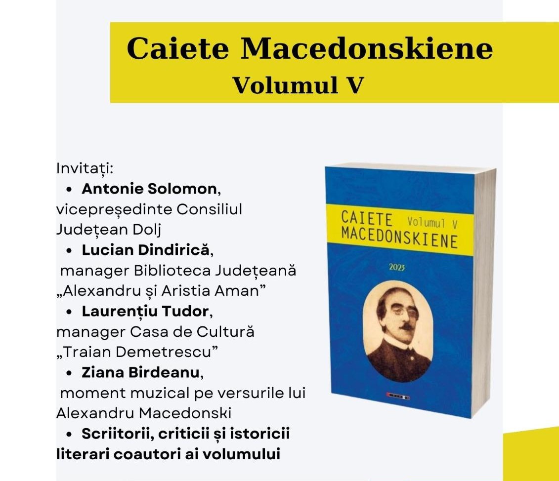 Biblioteca Judeţeană „Alexandru şi Aristia Aman” găzduieşte miercuri, 29 noiembrie 2023, începând cu ora 14.00, în sala „Acad. Dinu C. Giurescu”, lansarea volumului V al Caietelor macedonskiene (coordonator Ion Munteanu), publicat la Editura Eikon București.