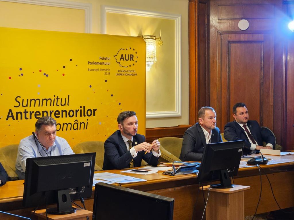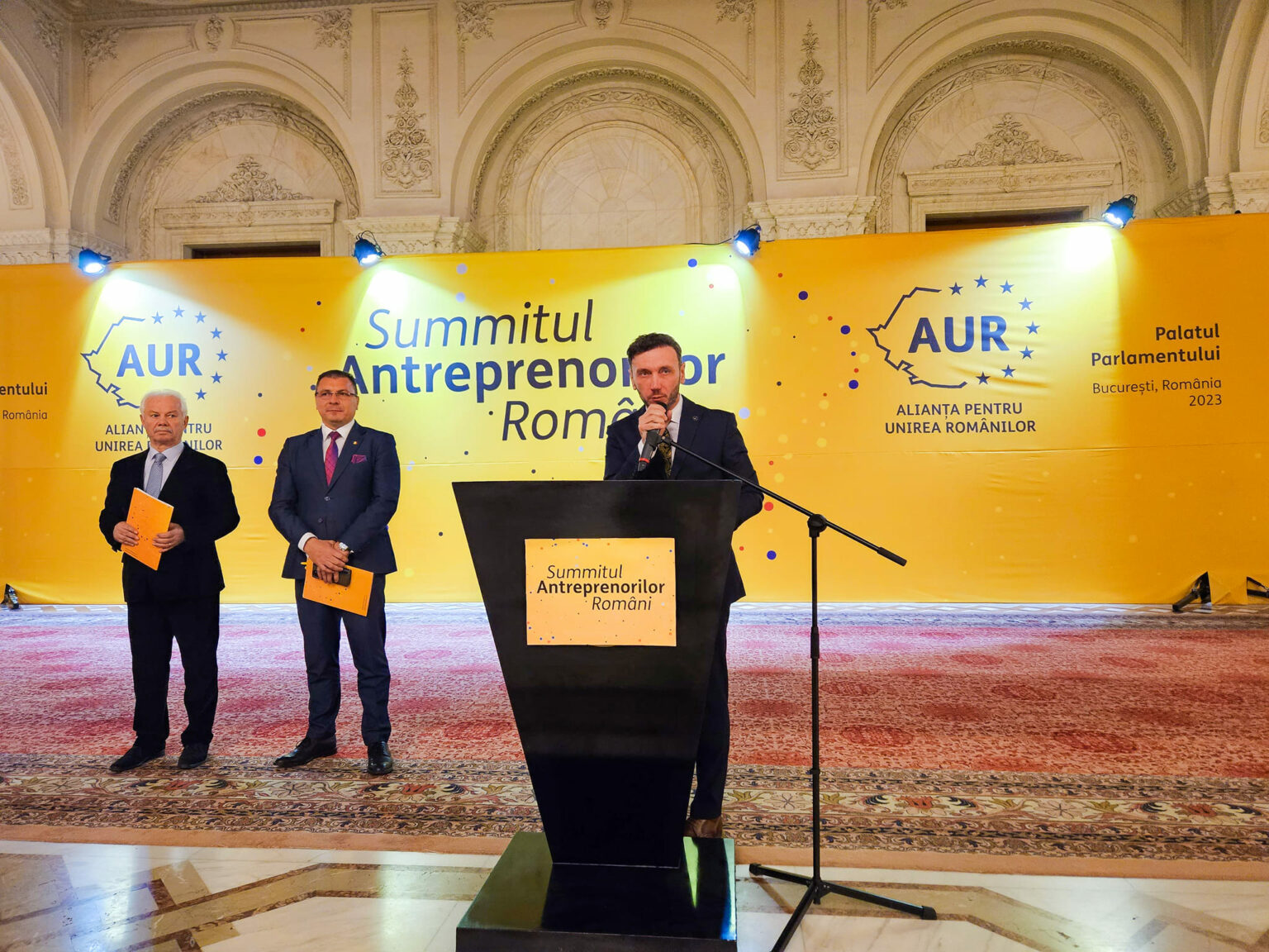 Aproape 2.500 de oameni de afaceri au luat parte, vineri, la „Summitul Antreprenorilor Români”, organizat de AUR, la Sala Unirii din Parlamentul României.