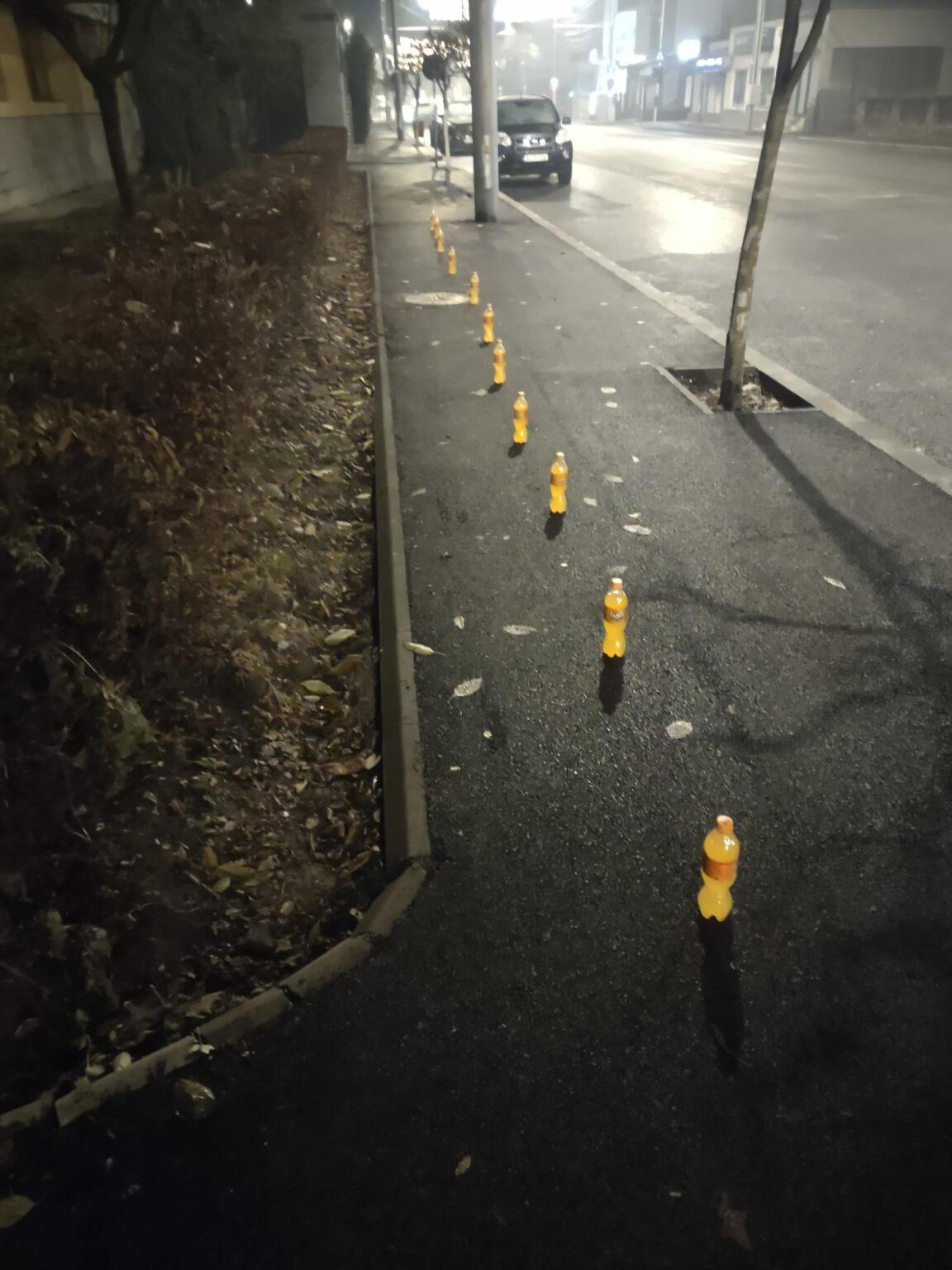 Tânărul a plasat mai multe sticle de băuturi răcoritoare pe trotuar, anunțând trecătorii că pot lua suc, deoarece nu există apă, cișmelele stradale fiind eliminate în urma lucrărilor de reabilitare a străzii. Această arteră, care nu mai dispune de puncte de apă, traversează în fața Centrului Militar Târgu Jiu până la sensul giratoriu de la CE Oltenia.