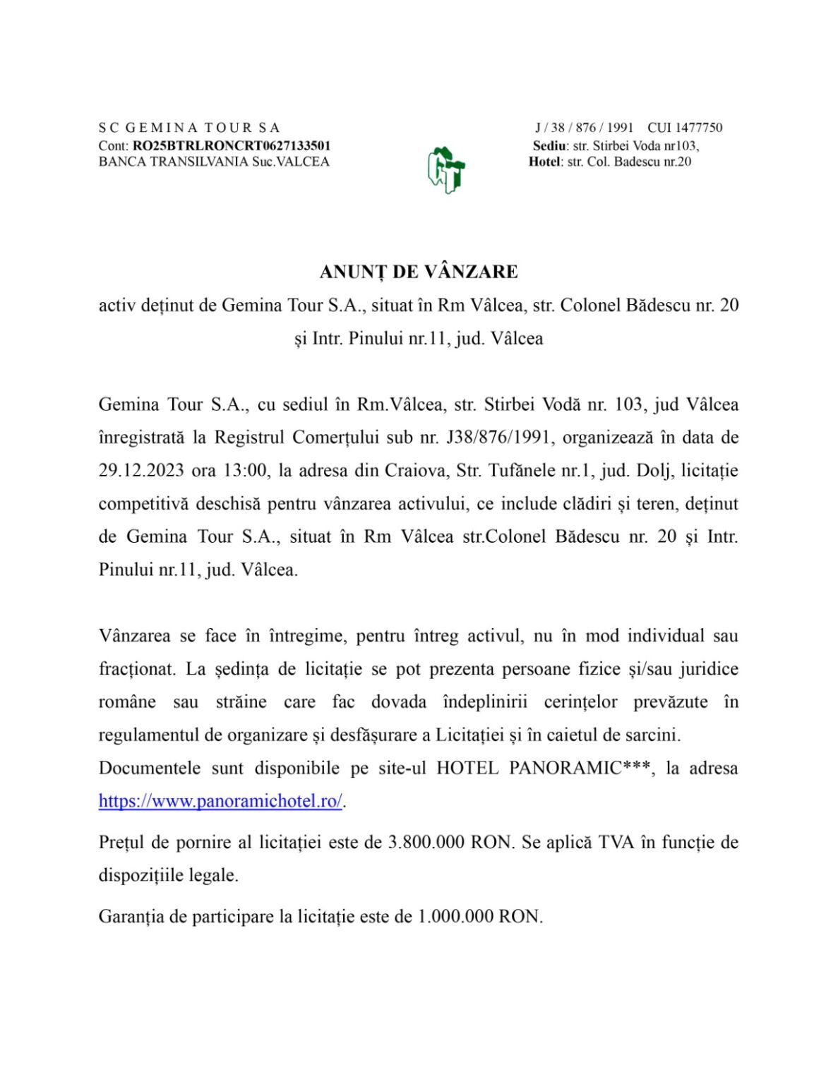 AnunturiAnunț de vânzare Hotel Panoramic Jurnalul Olteniei 22 decembrie 2023 Share SHARE Jurnalul Olteniei See Full Bio Distribuie acest articol Facebook Whatsapp Whatsapp Email Copy Link Print Articolul precedent Se deschide tronsonul 3 al Drumului Expres Craiova-Pitești Articolul următor ANUNȚ DE VÂNZARE a acțiunilor emise de Biroul De Investiții Regional Oltenia IFN S.A. deținute de Infinity Capital Investments S.A. Ultima ora Se știe grupa în care poate juca România la Cupa Mondială din 2026 5 decembrie 2025 Dolj: Ajutoare sociale de peste 76 milioane lei 5 decembrie 2025 Cea de-a VII-a ediție a Semimaratonului Craiovei a avut loc sâmbătă, 18 octombrie 2025. 5 decembrie 2025 ANUNT PRIVIND ORGANIZAREA ACHIZITIEI DE UTILAJE . MINIEXCAVATOR – LOTUL 1, UTILAJ DE FORAT HIDRAULIC – LOTUL 2 – RELUATÃ 2 5 decembrie 2025 Modernizarea CF Filiași: Începe proiectarea 5 decembrie 2025 Testare gratuită HPV la Spitalul Județean Târgu Jiu 5 decembrie 2025 CE Oltenia raportează emisii scăzute de dioxid de carbon 5 decembrie 2025 DIICOT a destructurat un grup de proxenetism în Mehedinți 5 decembrie 2025 Legea pensiilor magistraților, atacată, din nou, la CCR 5 decembrie 2025 Magia Crăciunului Târgu Jiu: Seară de neuitat 5 decembrie 2025