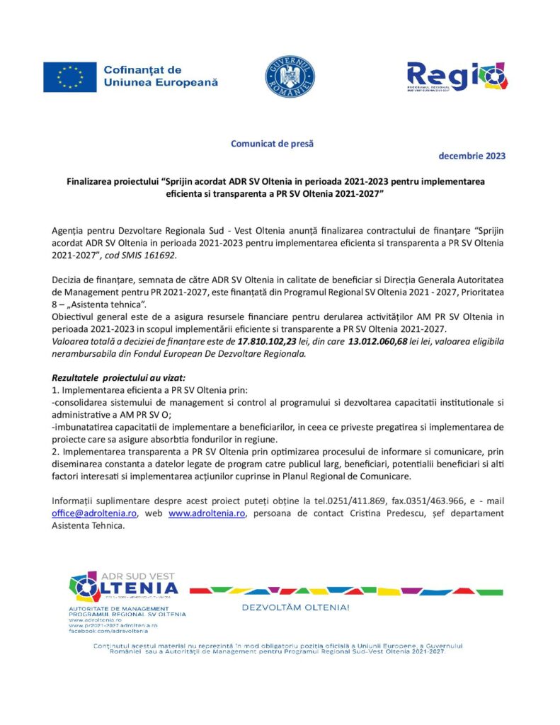 AnunturiFinalizarea proiectului “Sprijin acordat ADR SV Oltenia in perioada 2021 2023 pentru implementarea eficienta si transparenta a PR SV Oltenia 2021 2027” Jurnalul Olteniei 22 decembrie 2023 Share SHARE Jurnalul Olteniei See Full Bio Distribuie acest articol Facebook Whatsapp Whatsapp Email Copy Link Print Articolul precedent ANUNȚ DE VÂNZARE a acțiunilor emise de Biroul De Investiții Regional Oltenia IFN S.A. deținute de Infinity Capital Investments S.A. Articolul următor VIDEO/A fugit de la locul accidentului, iar cum este căutat de poliție Ultima ora Se știe grupa în care poate juca România la Cupa Mondială din 2026 5 decembrie 2025 Dolj: Ajutoare sociale de peste 76 milioane lei 5 decembrie 2025 Cea de-a VII-a ediție a Semimaratonului Craiovei a avut loc sâmbătă, 18 octombrie 2025. 5 decembrie 2025 ANUNT PRIVIND ORGANIZAREA ACHIZITIEI DE UTILAJE . MINIEXCAVATOR – LOTUL 1, UTILAJ DE FORAT HIDRAULIC – LOTUL 2 – RELUATÃ 2 5 decembrie 2025 Modernizarea CF Filiași: Începe proiectarea 5 decembrie 2025 Testare gratuită HPV la Spitalul Județean Târgu Jiu 5 decembrie 2025 CE Oltenia raportează emisii scăzute de dioxid de carbon 5 decembrie 2025 DIICOT a destructurat un grup de proxenetism în Mehedinți 5 decembrie 2025 Legea pensiilor magistraților, atacată, din nou, la CCR 5 decembrie 2025 Magia Crăciunului Târgu Jiu: Seară de neuitat 5 decembrie 2025