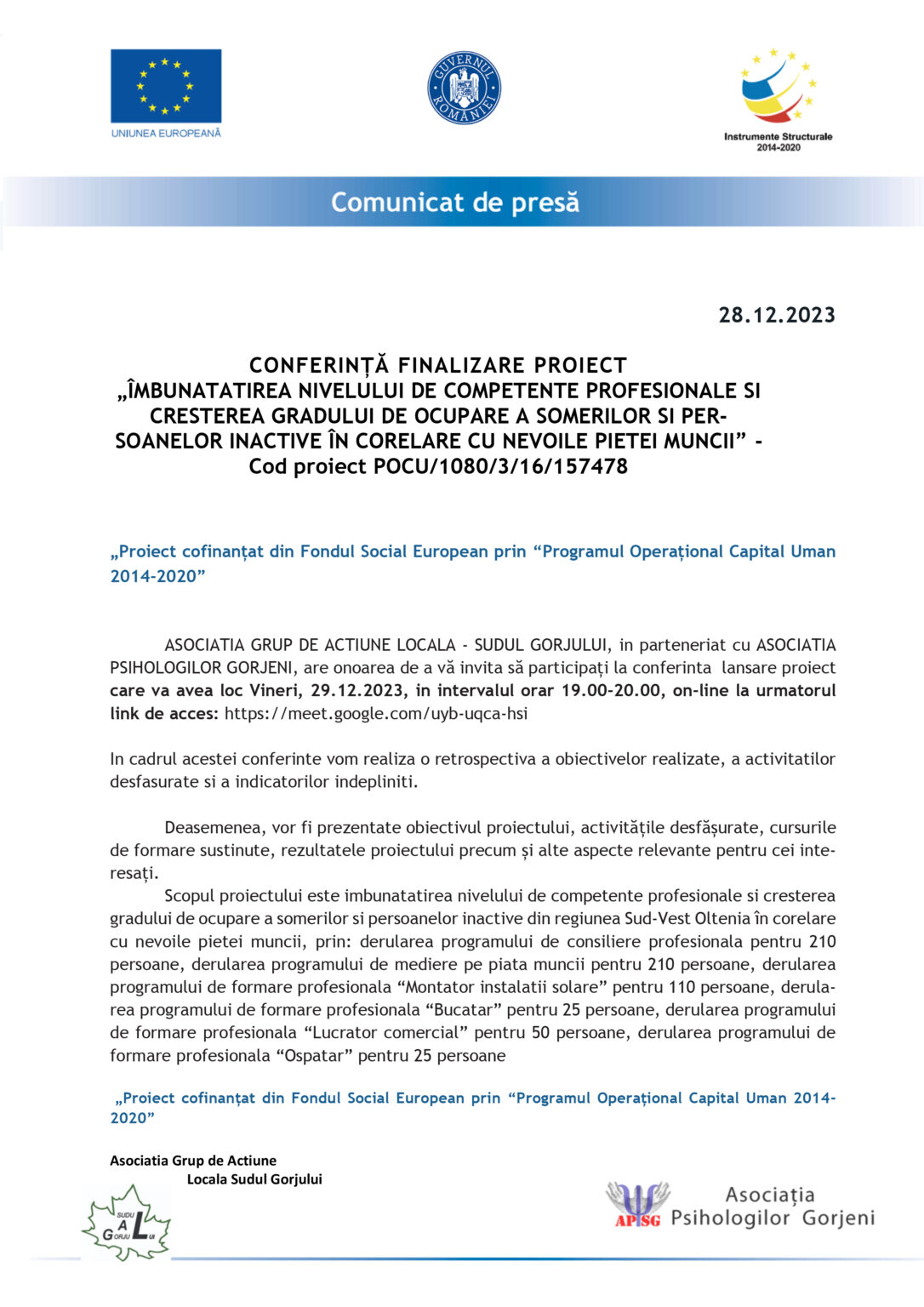 AnunturiCONFERINȚĂ FINALIZARE PROIECT „ÎMBUNĂTĂȚIREA NIVELULUI DE COMPETENȚE PROFESIONALE ȘI CREȘTEREA GRADULUI DE OCUPARE A ȘOMERILOR ȘI PERSOANELOR INACTIVE ÎN CORELARE CU NEVOILE PIEȚEI MUNCII” – Cod proiect POCU/1080/3/16/157478 Jurnalul Olteniei 9 aprilie 2024 Share SHARE Jurnalul Olteniei See Full Bio Distribuie acest articol Facebook Whatsapp Whatsapp Email Copy Link Print Articolul precedent 2023-cel mai bun an pentru Consiliul Județean Dolj Articolul următor Accident mortal la Drăgoești. A fost trimis elicopterul SMURD Ultima ora Se știe grupa în care poate juca România la Cupa Mondială din 2026 5 decembrie 2025 Dolj: Ajutoare sociale de peste 76 milioane lei 5 decembrie 2025 Cea de-a VII-a ediție a Semimaratonului Craiovei a avut loc sâmbătă, 18 octombrie 2025. 5 decembrie 2025 ANUNT PRIVIND ORGANIZAREA ACHIZITIEI DE UTILAJE . MINIEXCAVATOR – LOTUL 1, UTILAJ DE FORAT HIDRAULIC – LOTUL 2 – RELUATÃ 2 5 decembrie 2025 Modernizarea CF Filiași: Începe proiectarea 5 decembrie 2025 Testare gratuită HPV la Spitalul Județean Târgu Jiu 5 decembrie 2025 CE Oltenia raportează emisii scăzute de dioxid de carbon 5 decembrie 2025 DIICOT a destructurat un grup de proxenetism în Mehedinți 5 decembrie 2025 Legea pensiilor magistraților, atacată, din nou, la CCR 5 decembrie 2025 Magia Crăciunului Târgu Jiu: Seară de neuitat 5 decembrie 2025