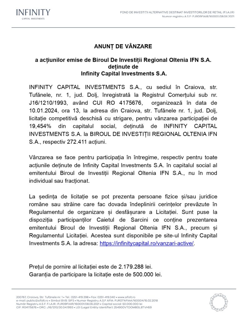 ANUNȚ DE VÂNZARE a acțiunilor emise de Biroul De Investiții Regional Oltenia IFN S.A. deținute de  Infinity Capital Investments S.A.
