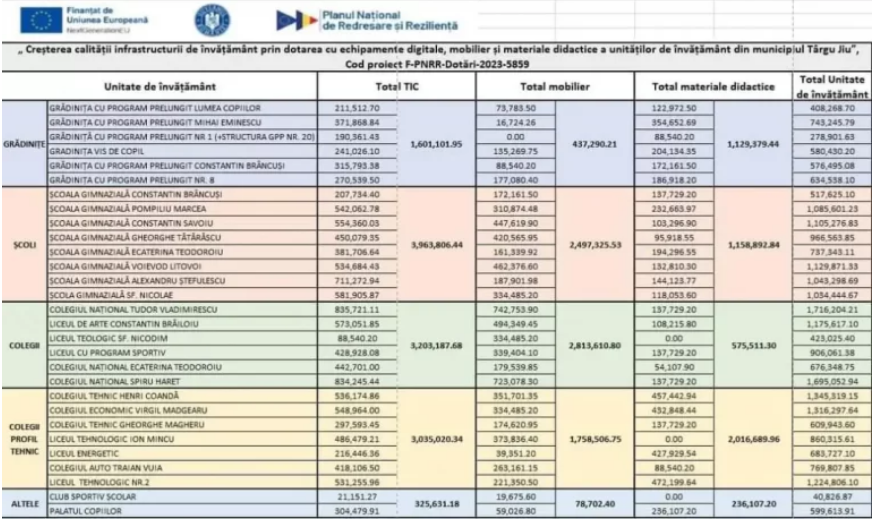 Unitățile de învățământ beneficiază de aceste sume pentru dotarea laboratoarelor, dotarea cu mobilier, dar și alte materiale didactice. Urmează, în curând, să demarăm licitațiile pentru achiziționarea mobilierului, dar și a materialelor didactice care vor ajunge la școlile din municipiu. Vă prezint lista unităților de învățământ și valoarea în lei a echipamentelor care vor fi achiziționate”, a anunțat primarul Romanescu, conform Gorjeanul.
