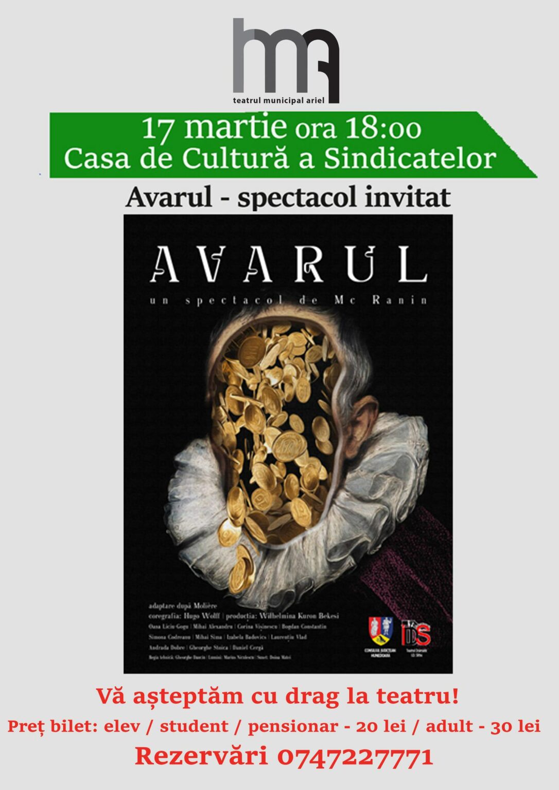 „Avarul” este una din cele mai cunoscute piese de Molière, cu o poveste destul de complexă, dar cu atât mai spumoasă. Zgârcitul Harpagon este obsedat să-și păzească avuția, iar pentru asta face orice, neglijându-și copiii și prefăcându-se falit. Un complot deștept al celor din jur îl face să-și piardă bănetul, acceptând niște compromisuri pentru binele altora.