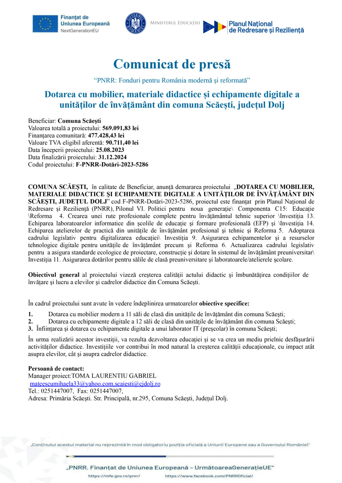 AnunturiDotarea cu mobilier, materiale didactice și echipamente digitale a unităților de învățământ din comuna Scăești, județul Dolj Jurnalul Olteniei 8 aprilie 2024 Share SHARE Jurnalul Olteniei See Full Bio Distribuie acest articol Facebook Whatsapp Whatsapp Email Copy Link Print Articolul precedent Doljean reținut pentru că a furat din două magazine. A luat băutură și țigări Articolul următor Comunicat de presă finalizare implementare proiect ” Crearea unei noi unitati de productie in cadru societatii Olaaru Taxi SRL” Ultima ora Se știe grupa în care poate juca România la Cupa Mondială din 2026 5 decembrie 2025 Dolj: Ajutoare sociale de peste 76 milioane lei 5 decembrie 2025 Cea de-a VII-a ediție a Semimaratonului Craiovei a avut loc sâmbătă, 18 octombrie 2025. 5 decembrie 2025 ANUNT PRIVIND ORGANIZAREA ACHIZITIEI DE UTILAJE . MINIEXCAVATOR – LOTUL 1, UTILAJ DE FORAT HIDRAULIC – LOTUL 2 – RELUATÃ 2 5 decembrie 2025 Modernizarea CF Filiași: Începe proiectarea 5 decembrie 2025 Testare gratuită HPV la Spitalul Județean Târgu Jiu 5 decembrie 2025 CE Oltenia raportează emisii scăzute de dioxid de carbon 5 decembrie 2025 DIICOT a destructurat un grup de proxenetism în Mehedinți 5 decembrie 2025 Legea pensiilor magistraților, atacată, din nou, la CCR 5 decembrie 2025 Magia Crăciunului Târgu Jiu: Seară de neuitat 5 decembrie 2025