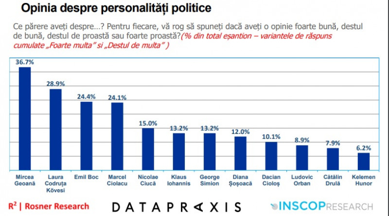 Mircea Geoană, Laura Codruța Kovesi și Emil Boc se regăsesc în topul figurilor politice. Marcel Ciolacu și președintele PNL, Nicolae Ciucă, figurează, de asemenea, în rândul celor cinci personalități politice apreciate de români.
